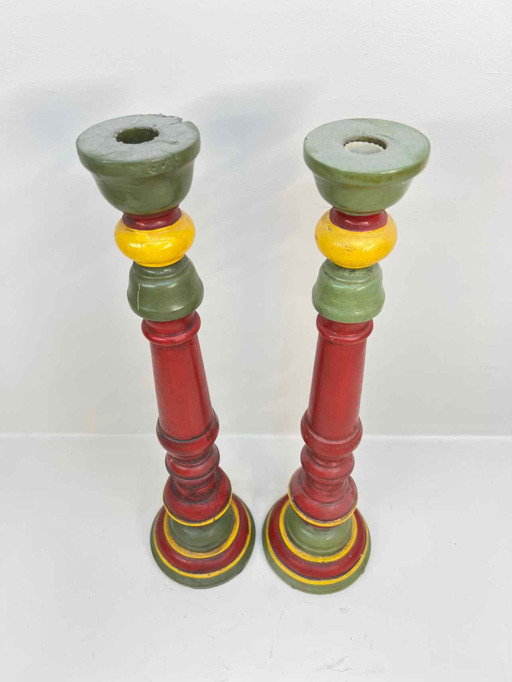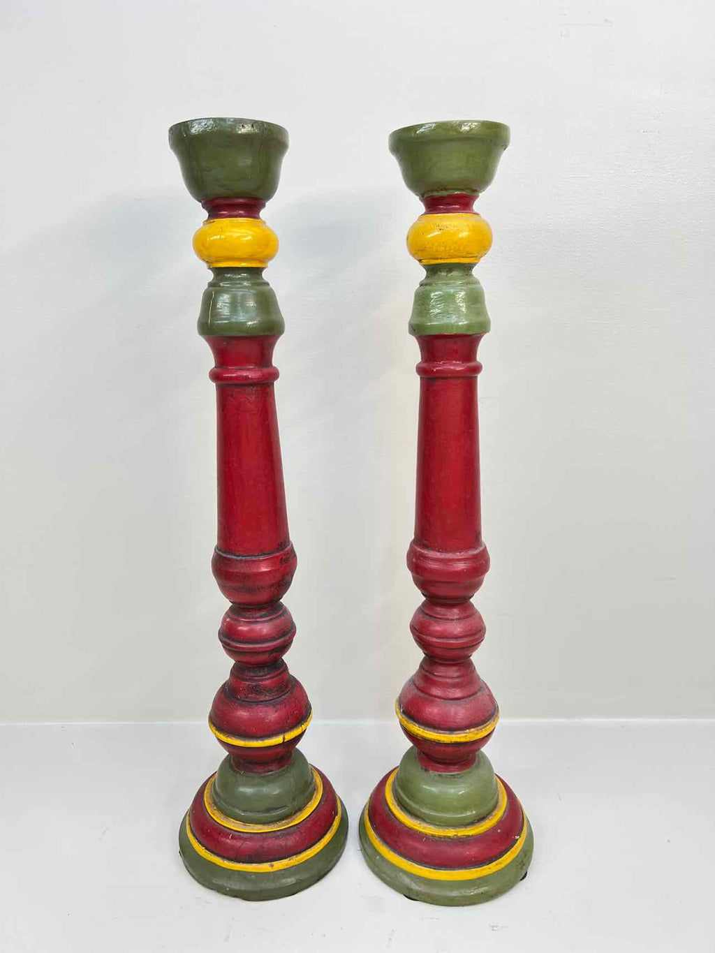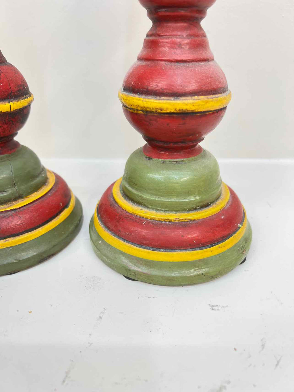 Set of 2 Vintage Wood Turned Candle Stick Holders Painted Red/Green/Yellow - 18" Tall