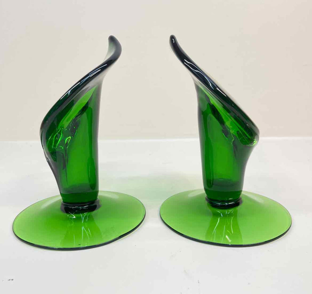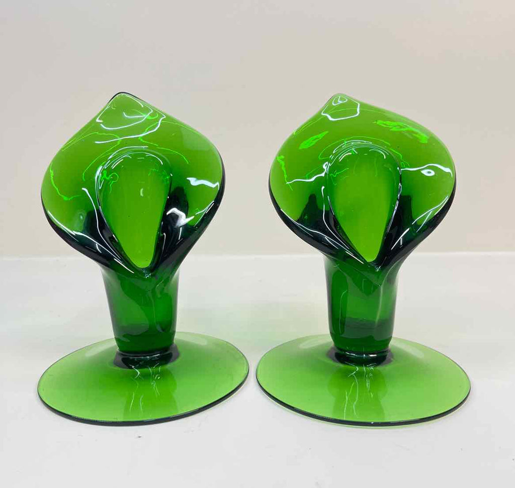 Set of 2 Vintage Emerald Green Glass Calla Lily Candle Holders - 6" Tall