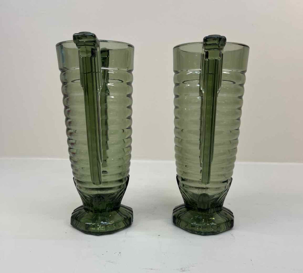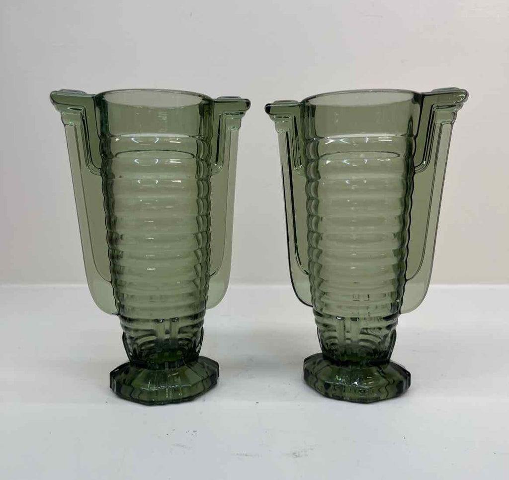 Set of 2 Vintage Art Deco Green Glass "Marcelle" Vase by Val Saint Lambert - 8" Tall