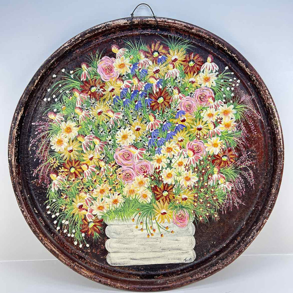 Handpainted Round Metal Wall Hanging Floral Piece - 24" Wide