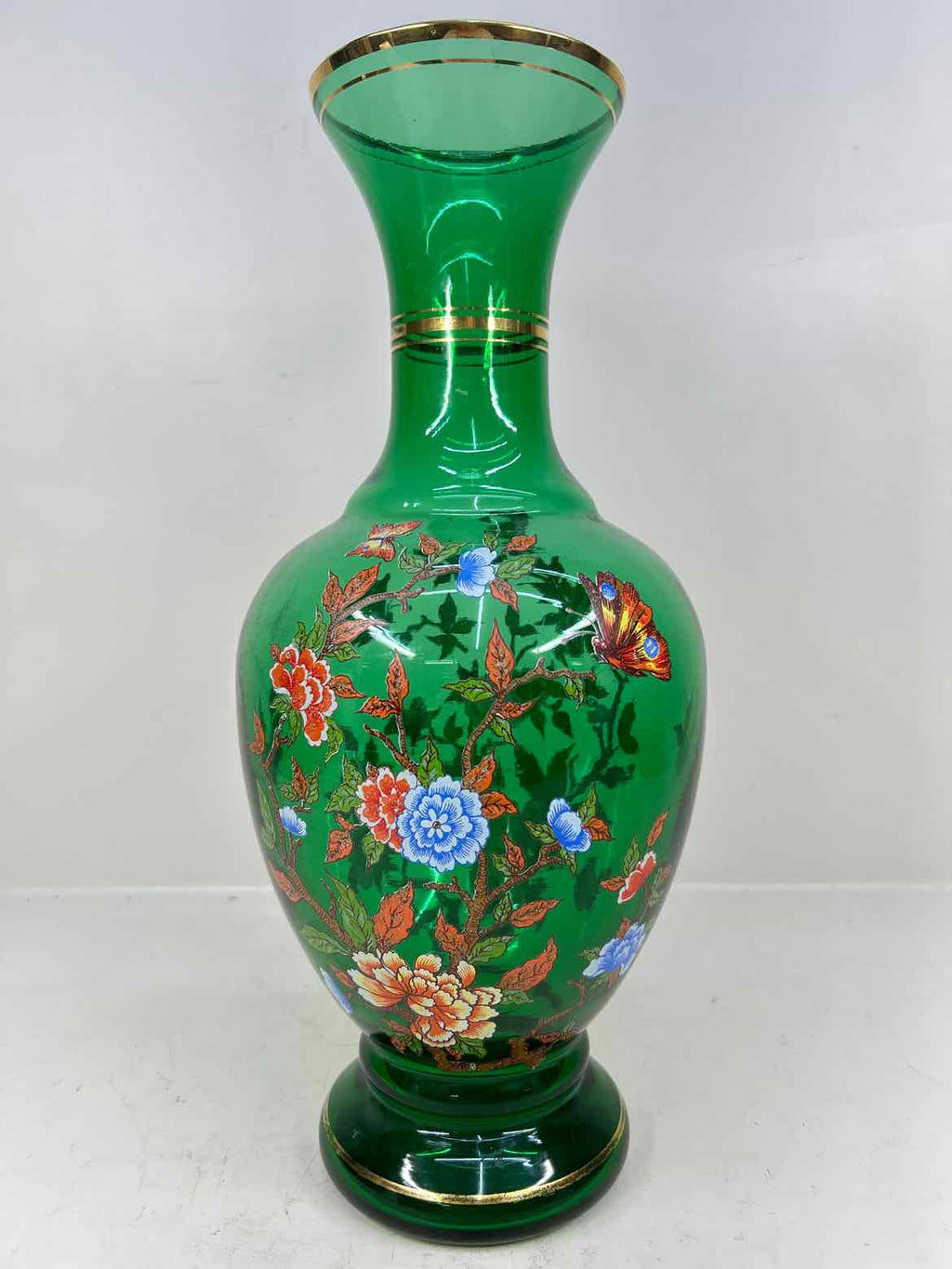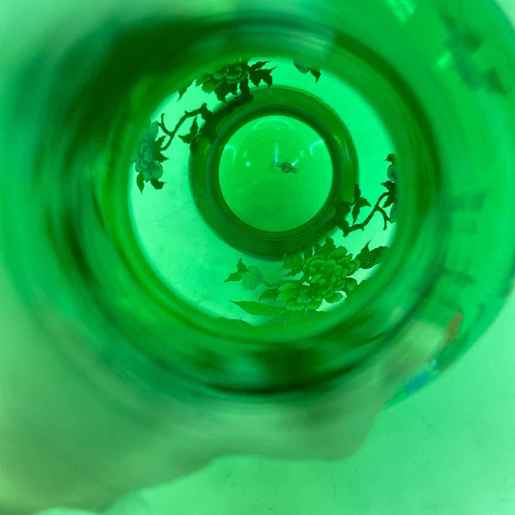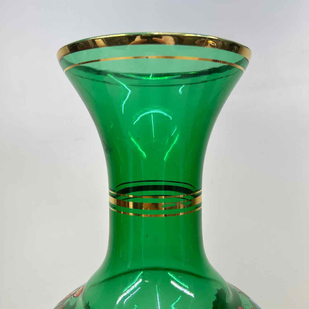 Clear Green Vase W/ Floral Print & Gold Trim - 17" Tall x 7" Wide