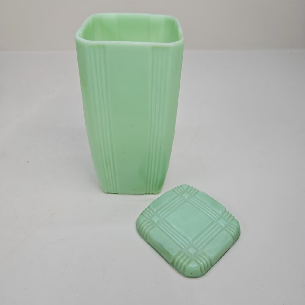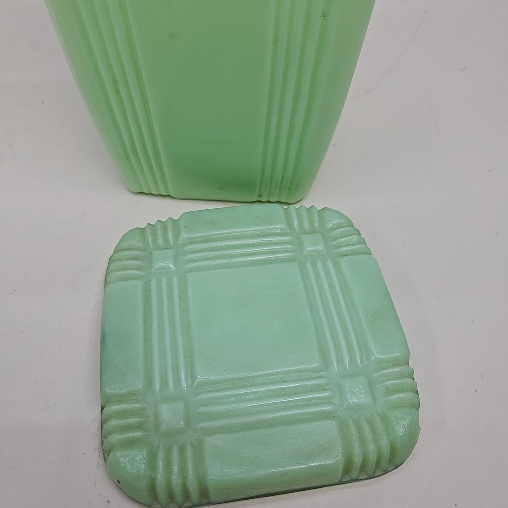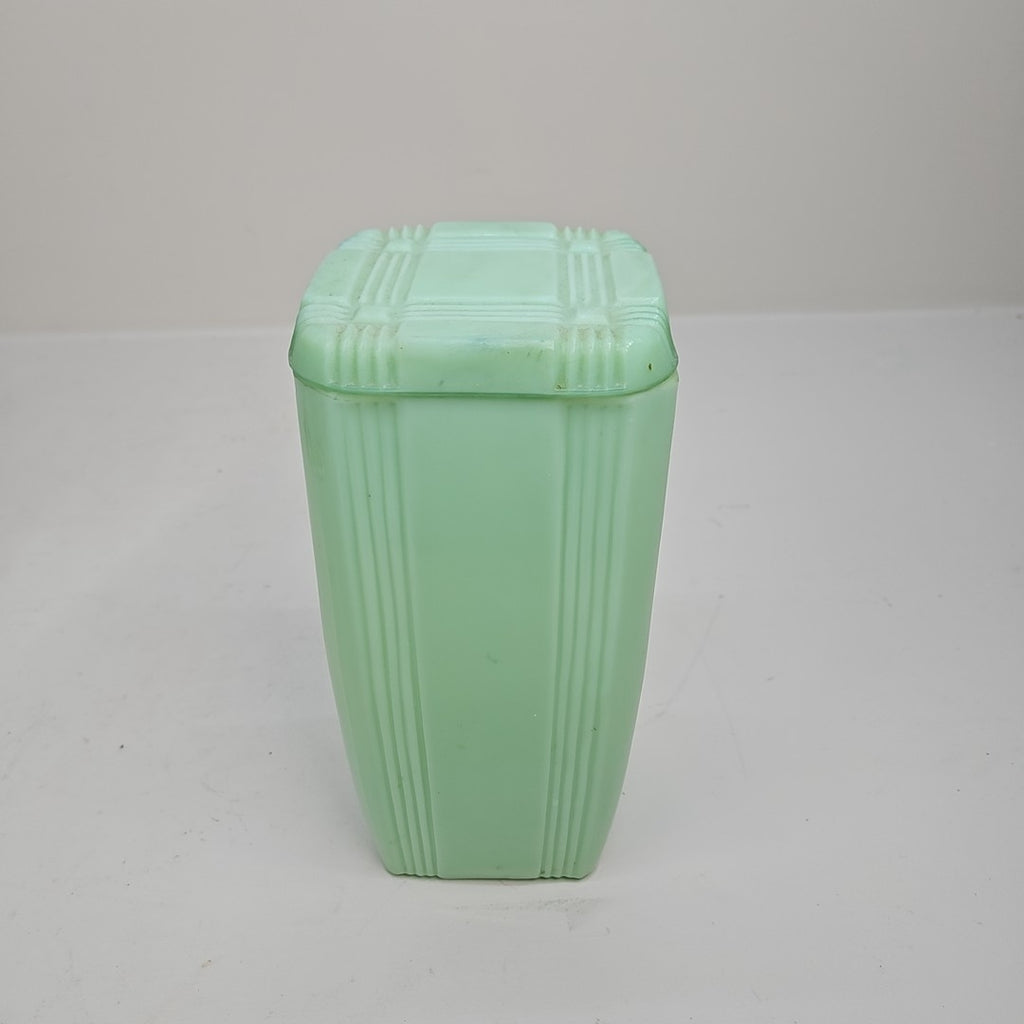 Jadite Style Glass Canister w Lid - Priced For Condition, Several Small Chips - 9" Tall x 4" Wide