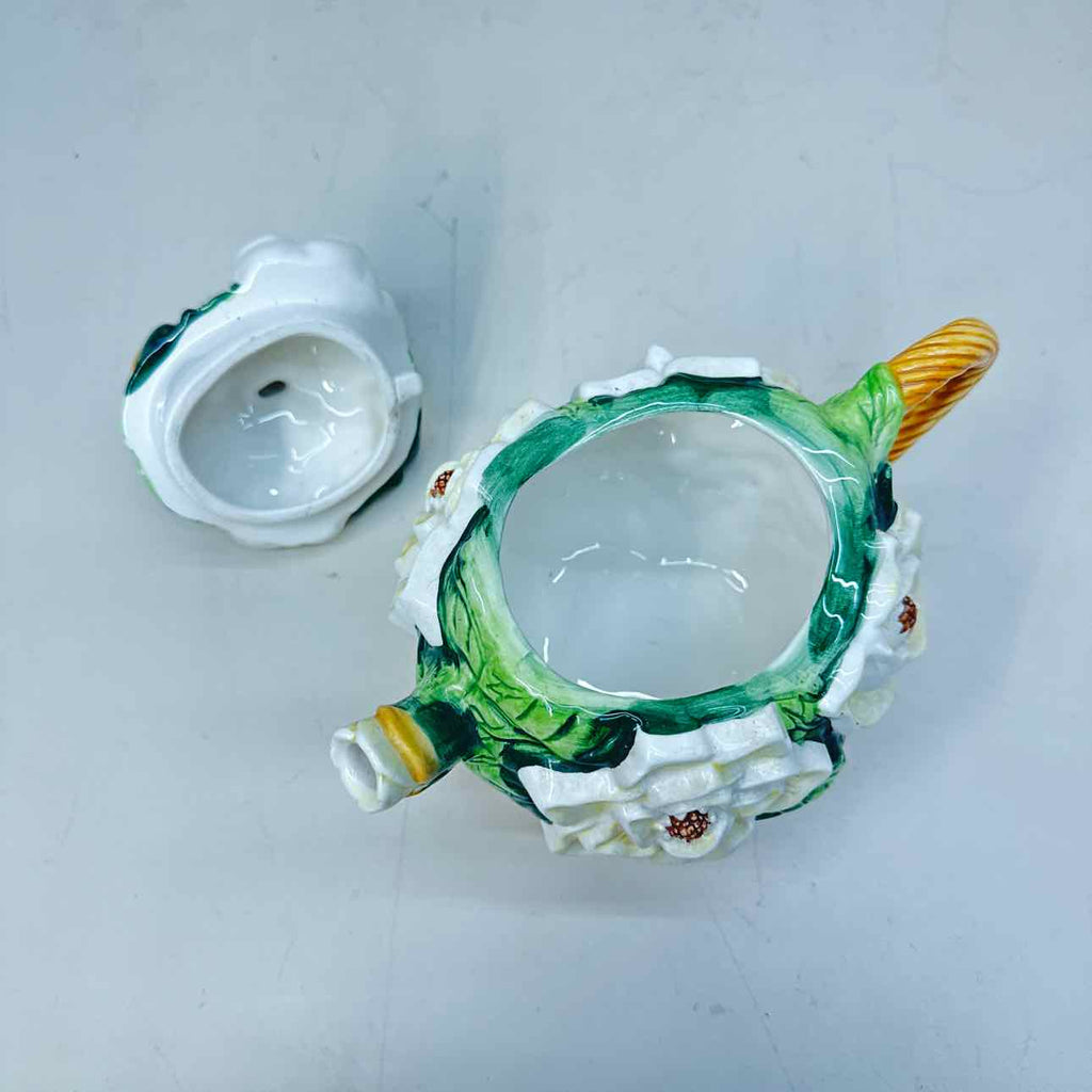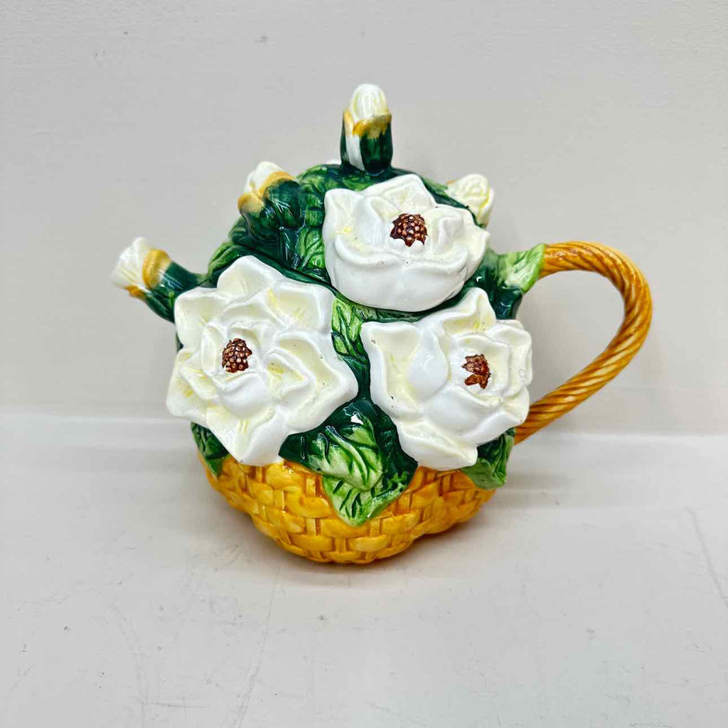 Vintage Teapot w/ Lid - White Magnolia Flowers in Basket - 7" Tall