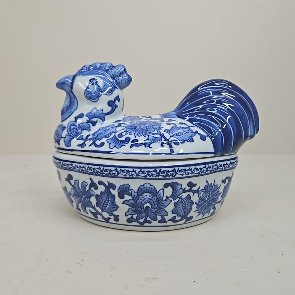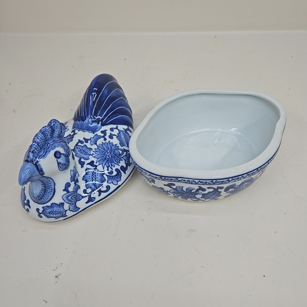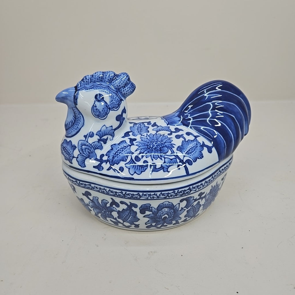 Blue & White Lidded Hen Dish - 6.5" Tall