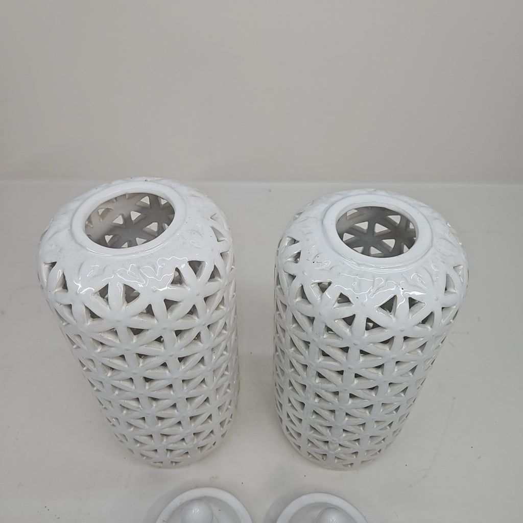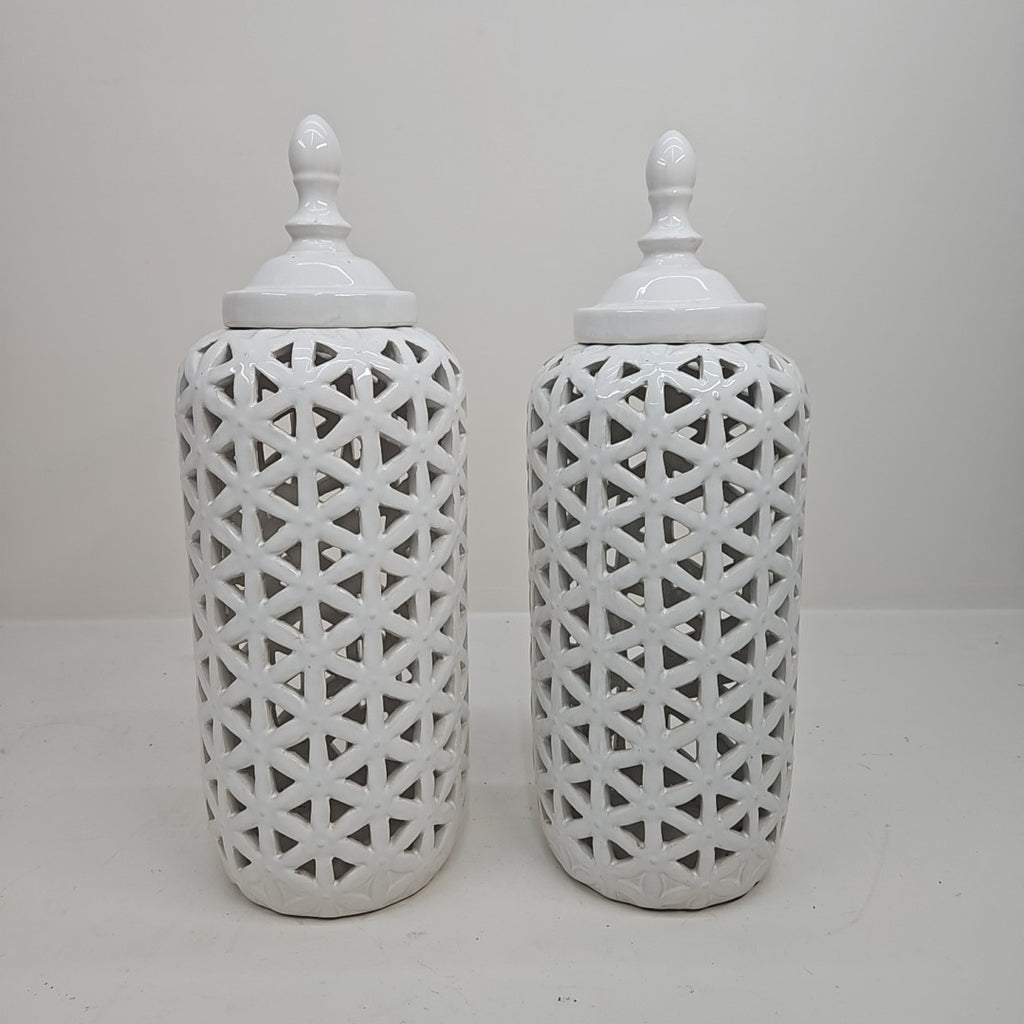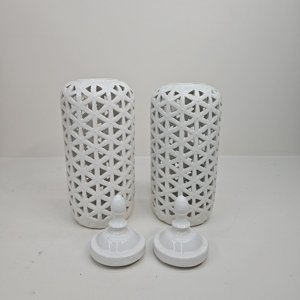 Set of 2 White Ceramic Reticulated Canister w/ Lid - 15.5" & 15.5 " Tall
