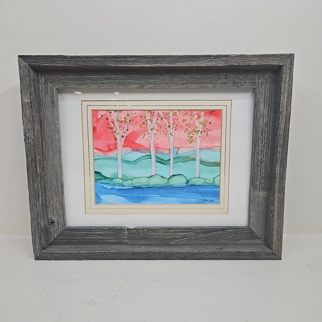 Framed Original Watercolor of Trees - Signed by Artist "J Synan" - 11.5" Tall x 14.5" Wide