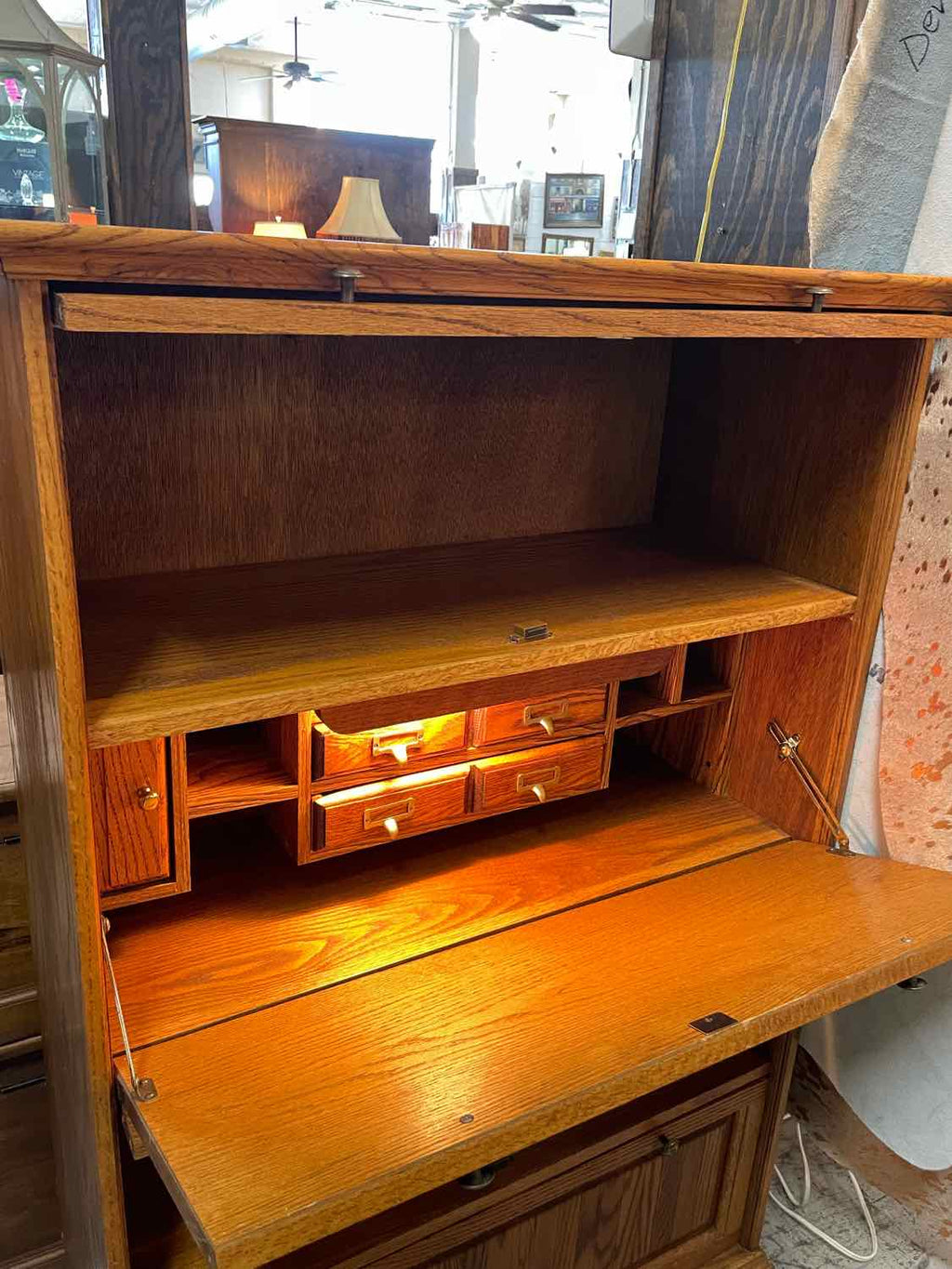 Solid Oak Drop Front Secretary w/ 2 Barrister Style Glass Doors, Light & 1 Filing Drawer - 54" Tall x 34.5" Wide x 15" Deep