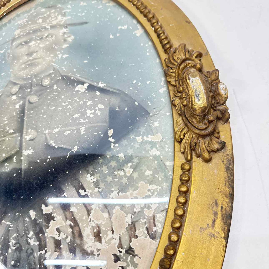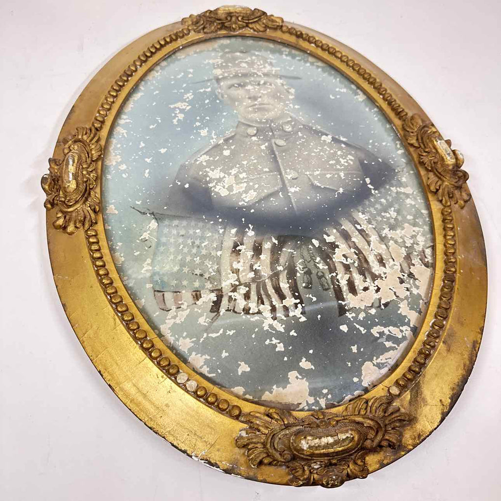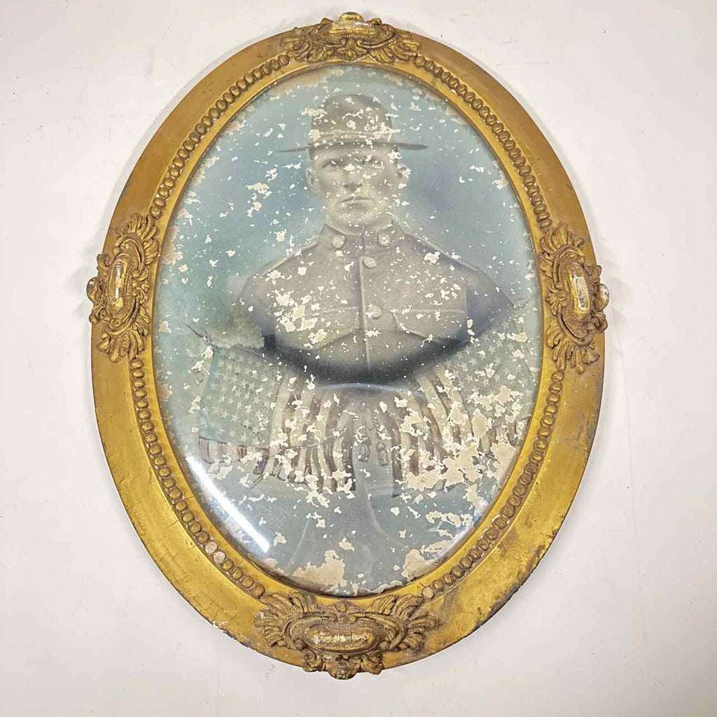 Antique Gold Painted Wood Framed w/ Curved Glass & Soldier Photo - 24" Tall x 17" Wide