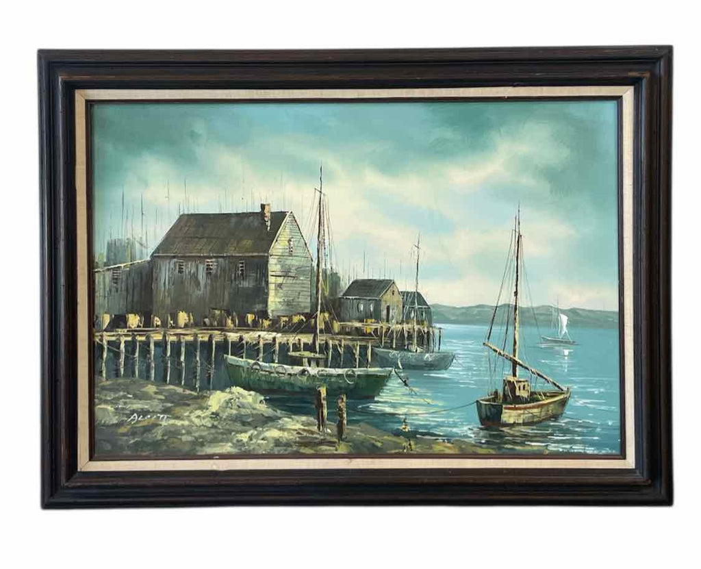 Vintage Framed Painting of Boats at Dock - Signed by Artist - 31" Tall x 43" Wide