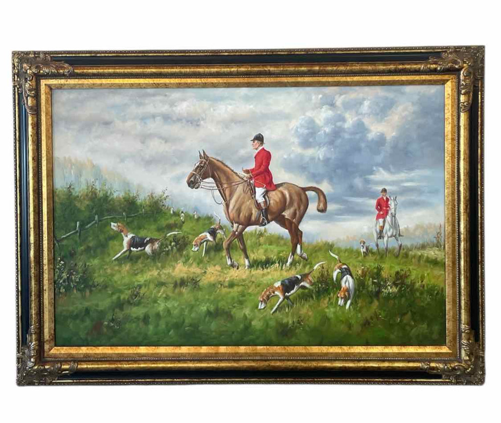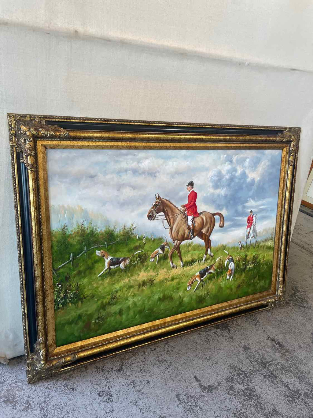 Large Framed Painting of Hunting Scene - Black & Gold Frame Measures 30.5" Tall x 42.5" Wide
