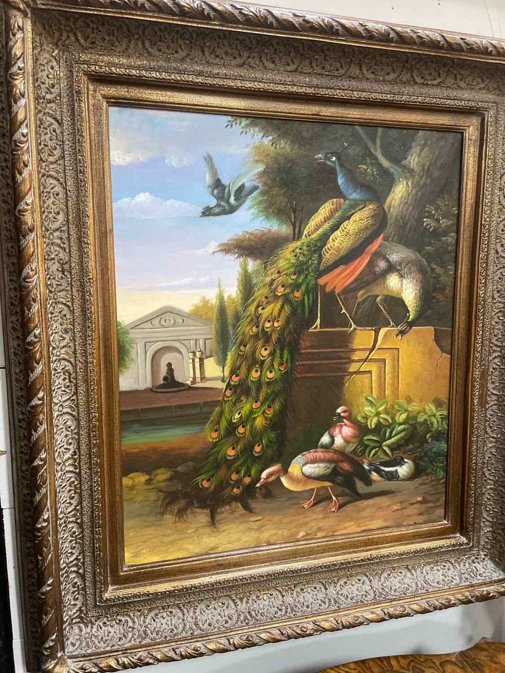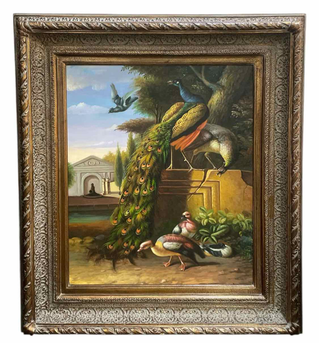 Framed Painting of Peacocks & Ducks - 34" Tall x 30" Wide