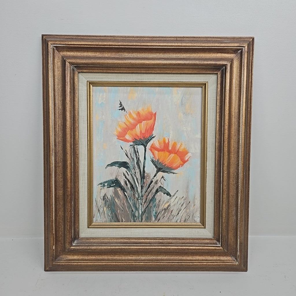 Framed Original Painting of Orange Poppy Flowers - Signed by Artist S.L. - 16.5" Tall x 14.5" Wide