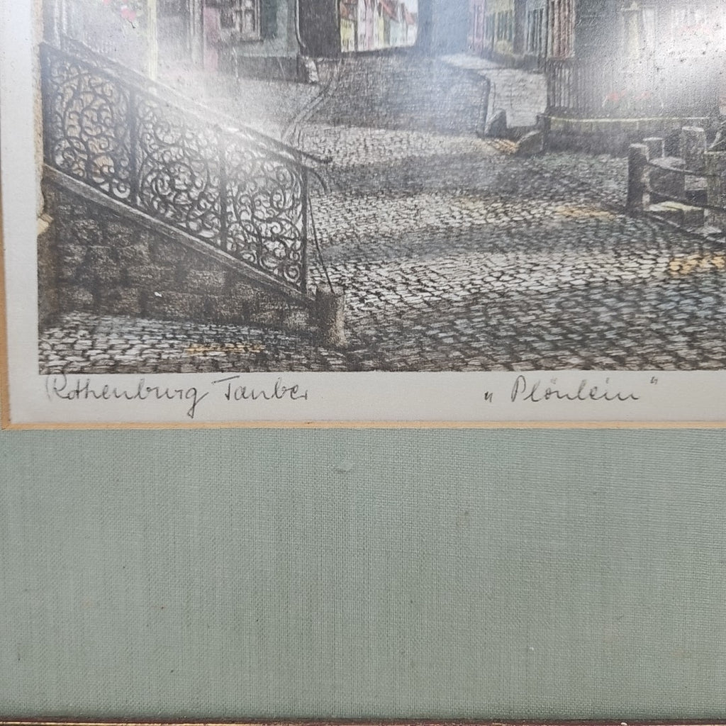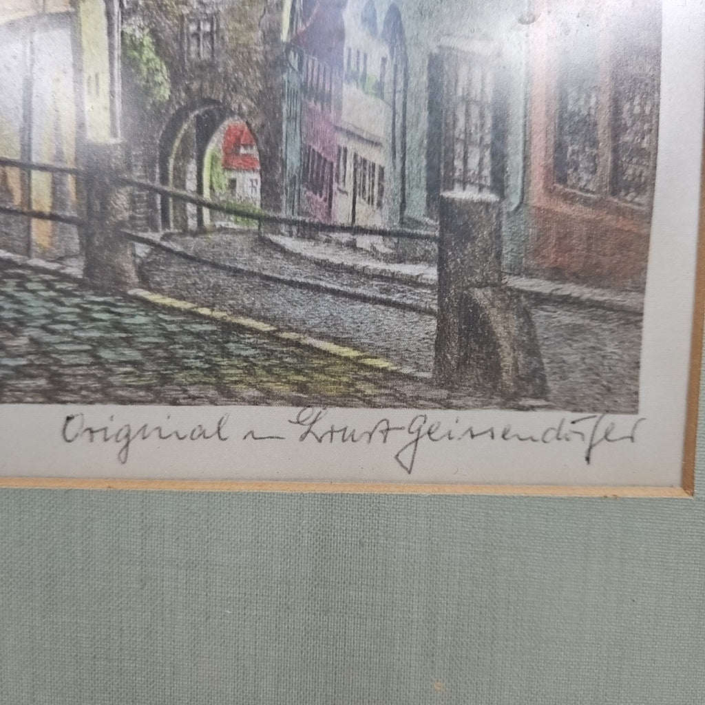 Vintage Handcolored Original Art on Silk of European Street Scene - Signed - Framed, Measures 15.5" Tall x 17.5" Wide