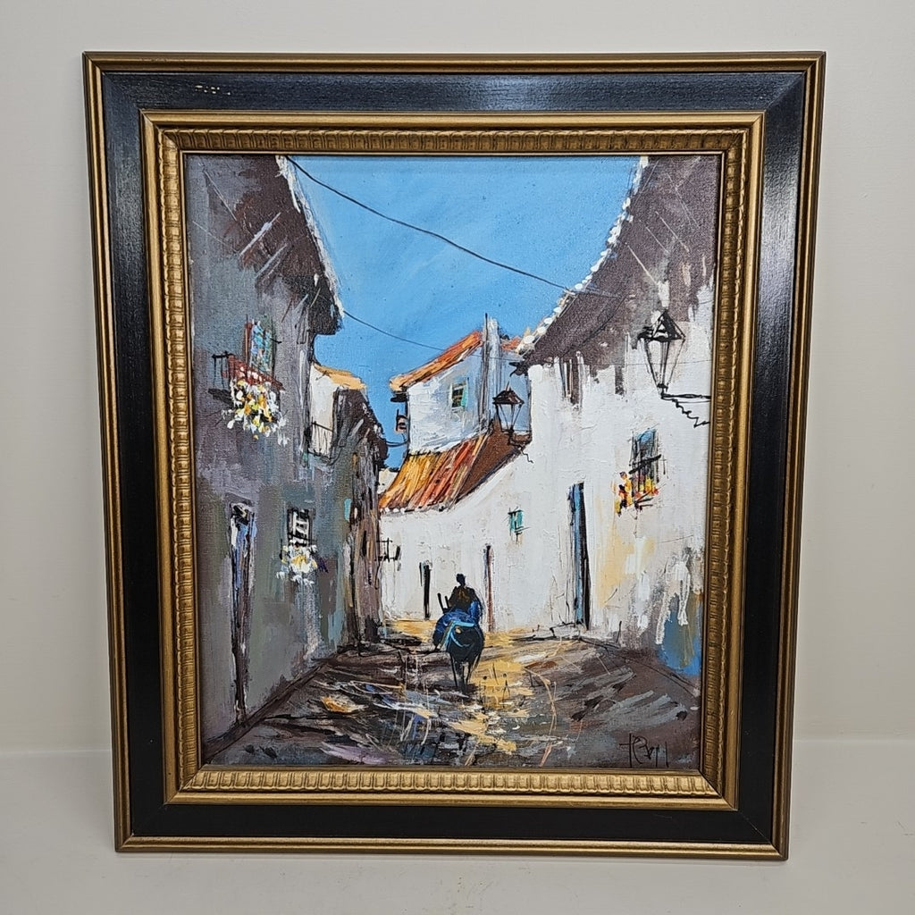 Framed Original Painting on Canvas of Man & Horse in Street - Artist Signed - 23" Tall x 20" Wide