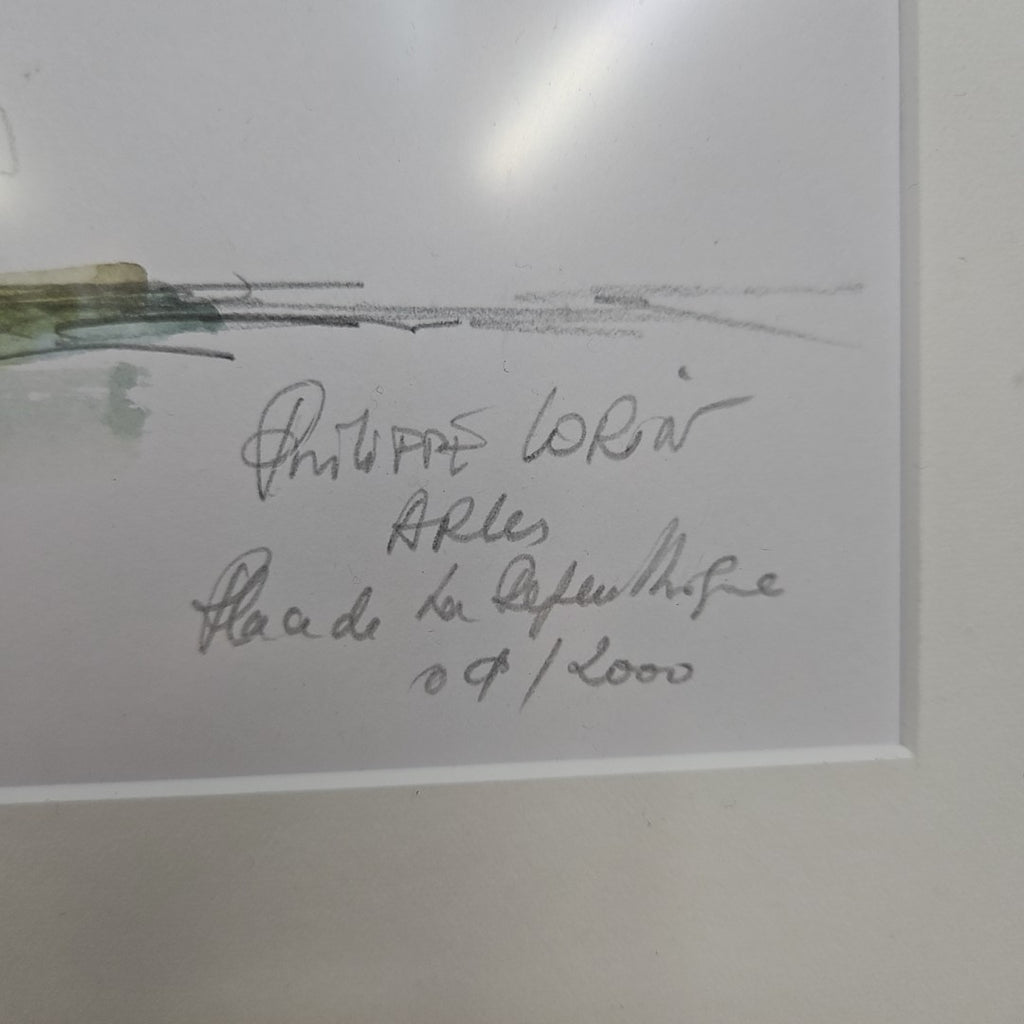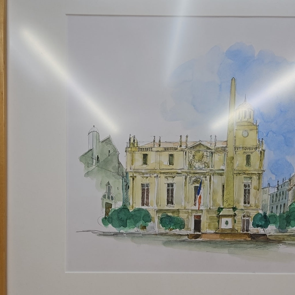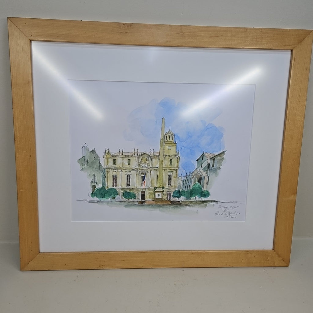 Framed Watercolor & Pencil by French Artist Philippe Lorin of Hotel de Ville in Arles France - Original Retail $450 - 21" Tall x 24.5" Wide