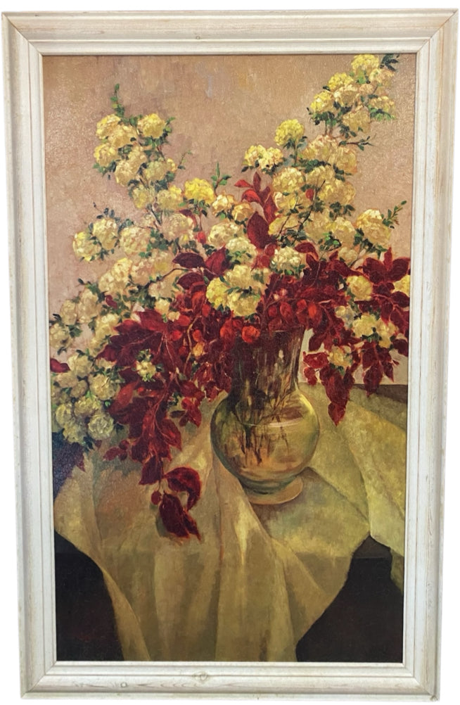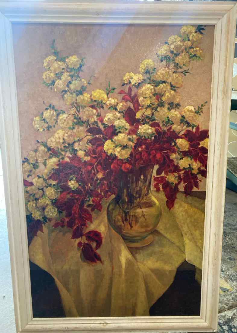 Red & Yellow Flowers in Vase W/ White Wood Frame - 39" Tall x 25" Wide