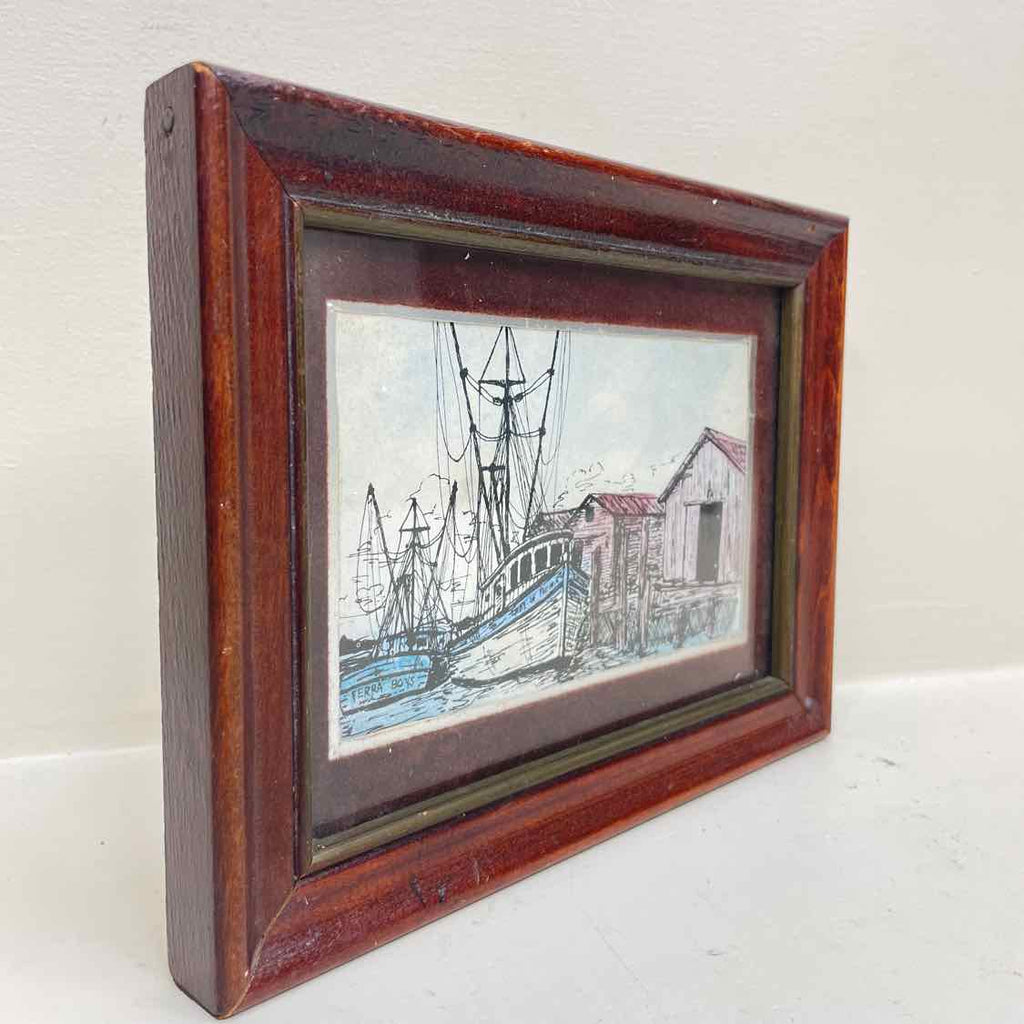 Petite Wood Framed Pen Drawn Art of Ships - 6" x 8"
