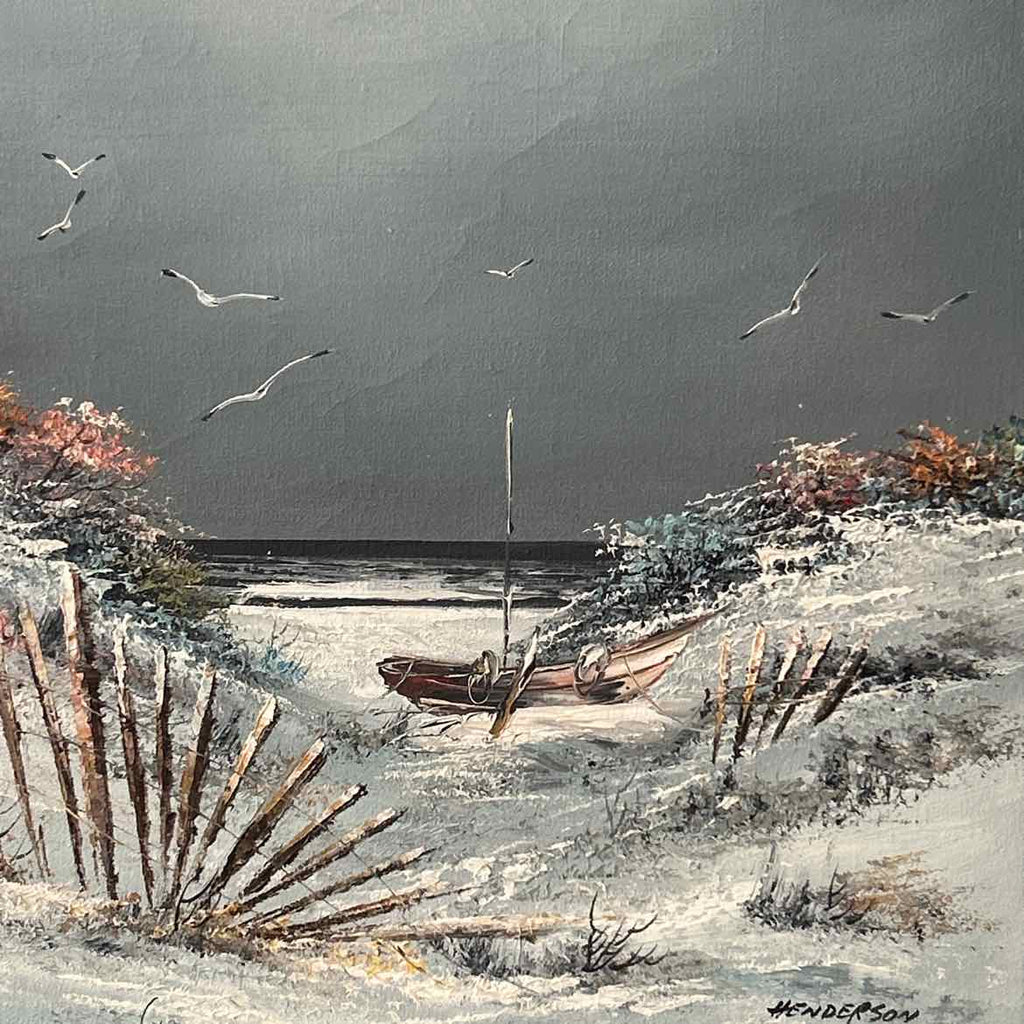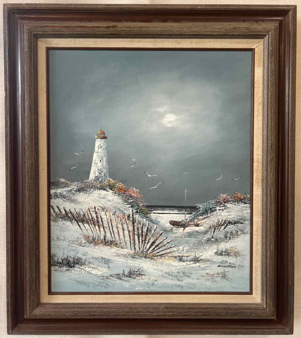 Wood Framed Original Painting on Canvas of Lighthouse & Beach - Signed Henderson - 33" Tall x 28" Wide