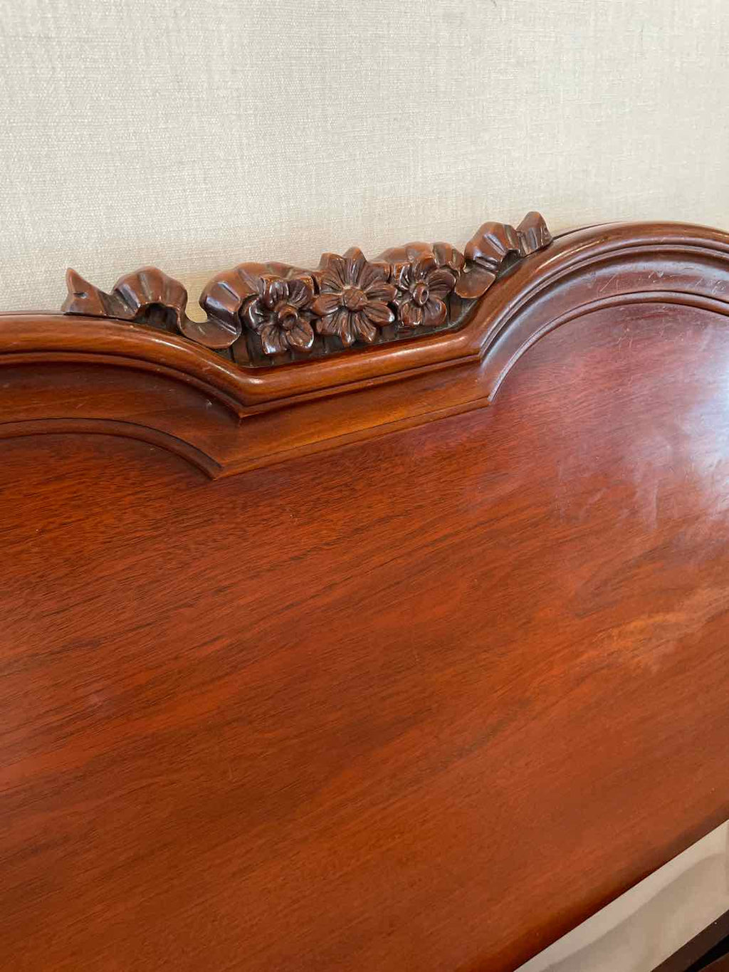 Full Size Mahogany Finish Bed w/ Carved Details - Headboard, Footboard, Rails & Slats - 42.5" Tall x 57" Wide