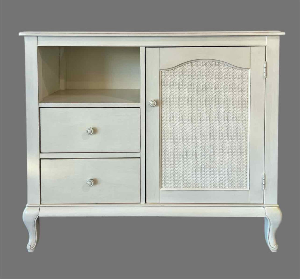 Solid Off-White Chest of Drawers with 1 Cane Front Door, 2 Drawers - 2 Pull Out Trays - 36" Tall x 41" Wide x 19" Deep