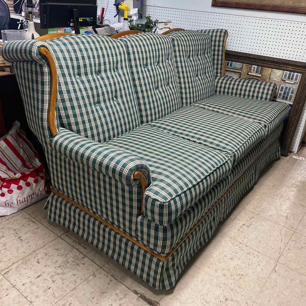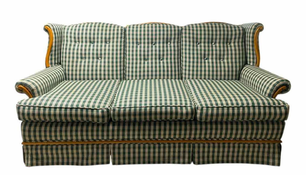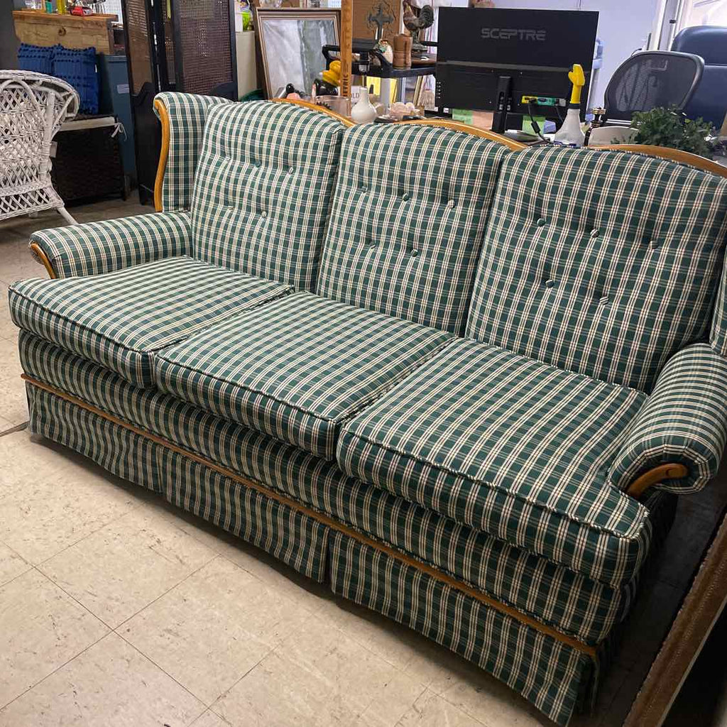 Vintage Wood Framed Sofa w/ Green & White Plaid Upholstery - 37" Tall x 75" Wide x 31" Deep