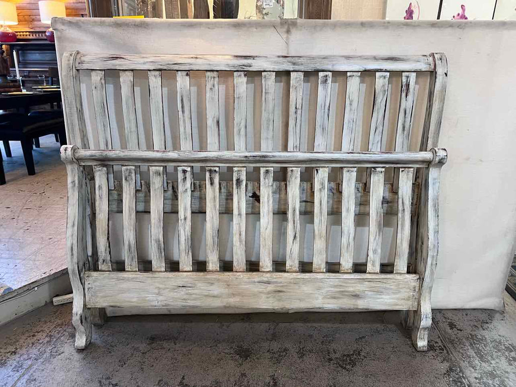 White Distressed Queen Sleigh Bed - Headboard, Footboard, Rails & Slats - 52" Tall x 63" Wide