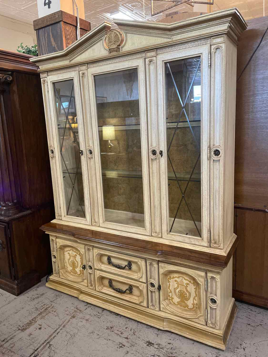 Vintage China Cabinet in Cream/Off White - 2 Glass Doors, 2 Solid Doors & 2 Drawers - 82.5" Tall x 61.5" Wide x 18" Deep