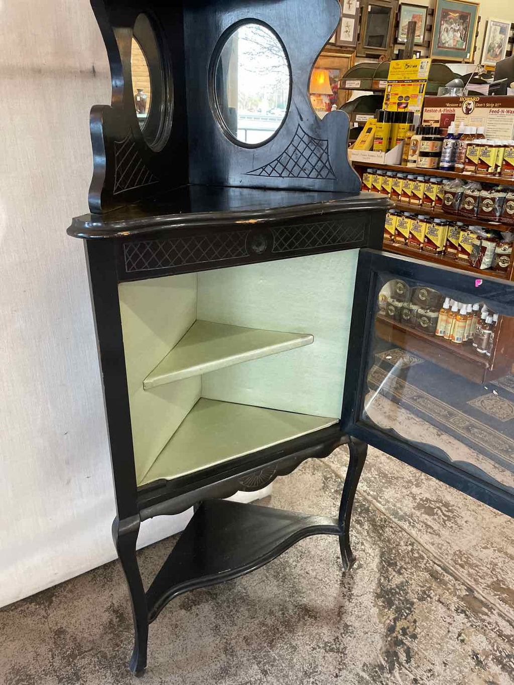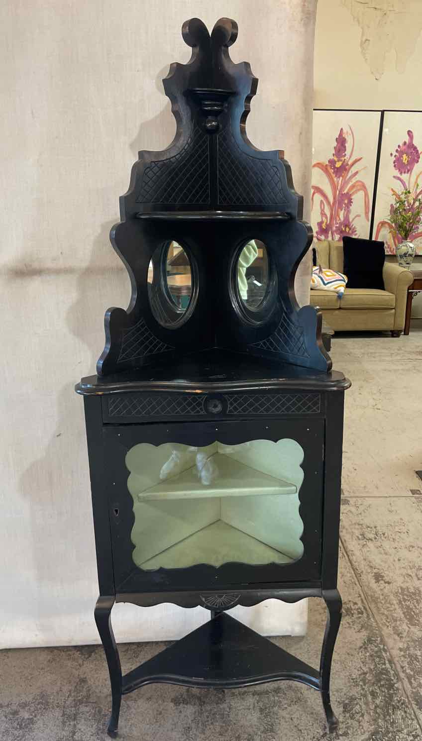 Black Painted Corner Cabinet w/ 1 Glass Door, Mirrors - 69" Tall x 24" Wide x 18" Deep