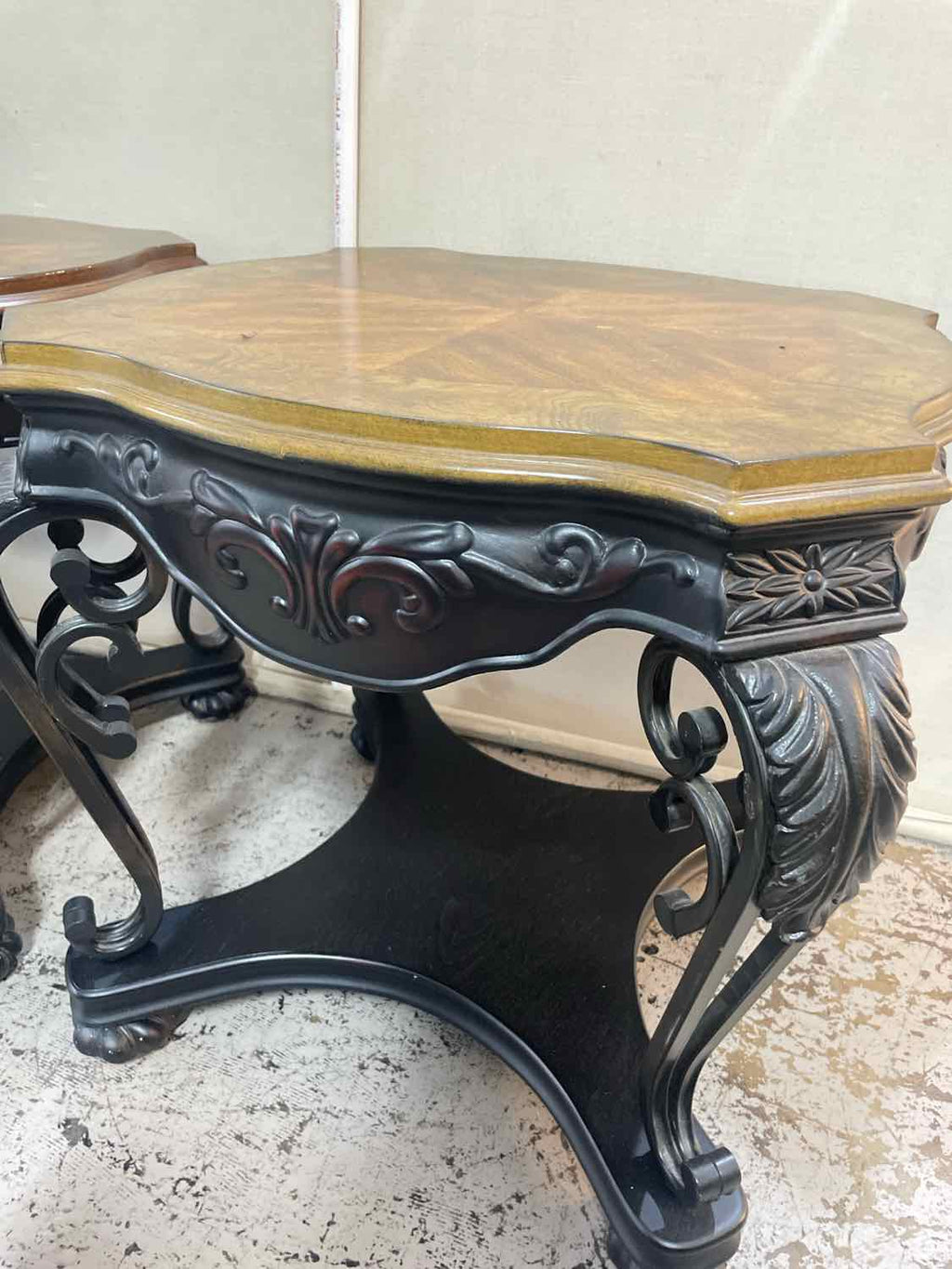 Set of 2 Ornate Black Wood & Metal End Tables w/ Brown Top - Priced for Condition - 25.5" Tall x 27" Wide x 27" Deep