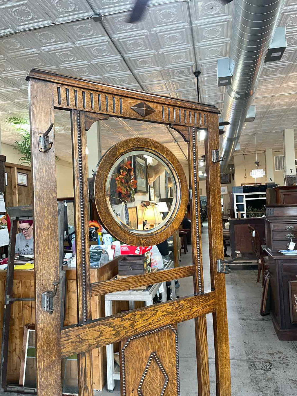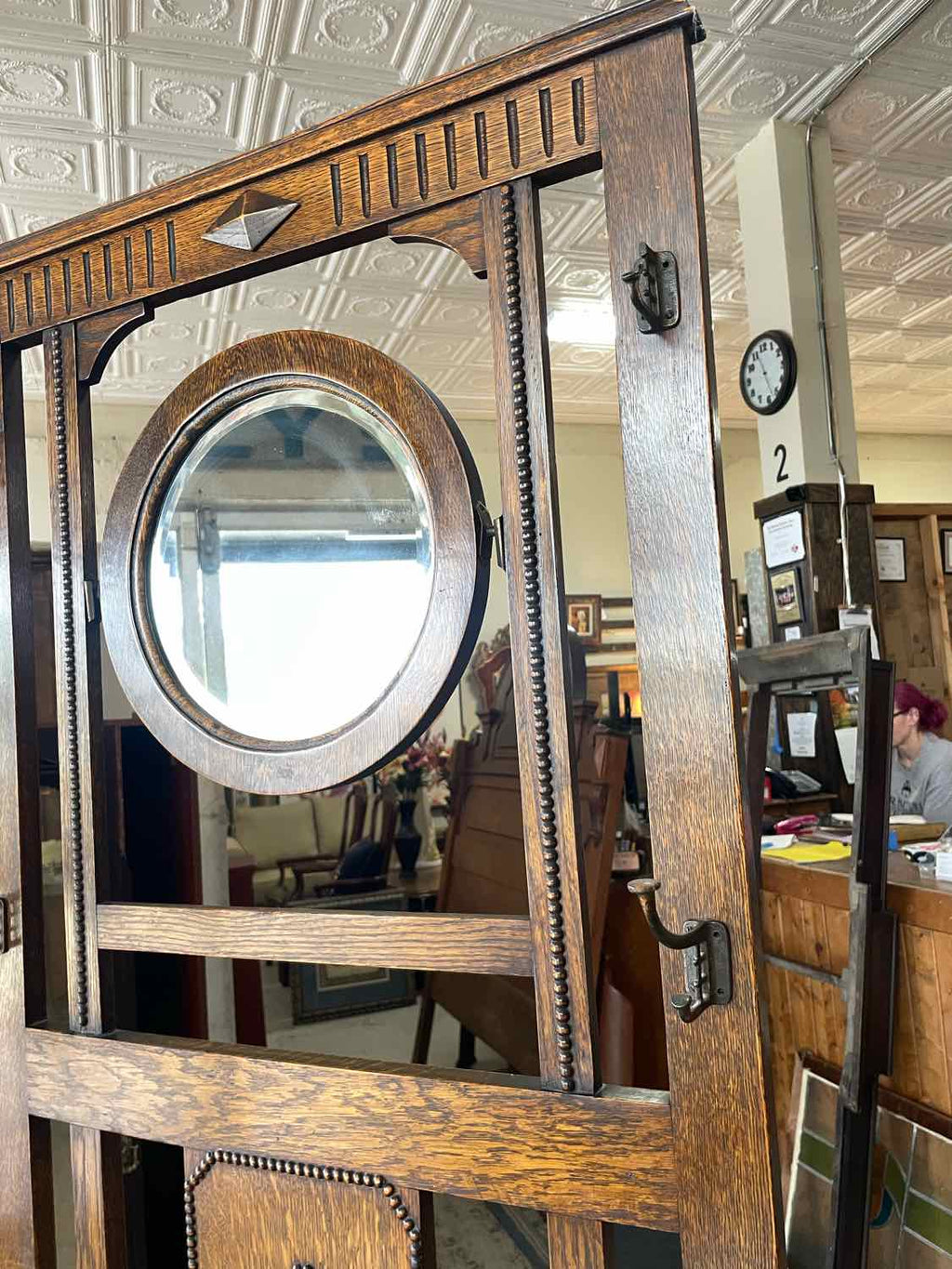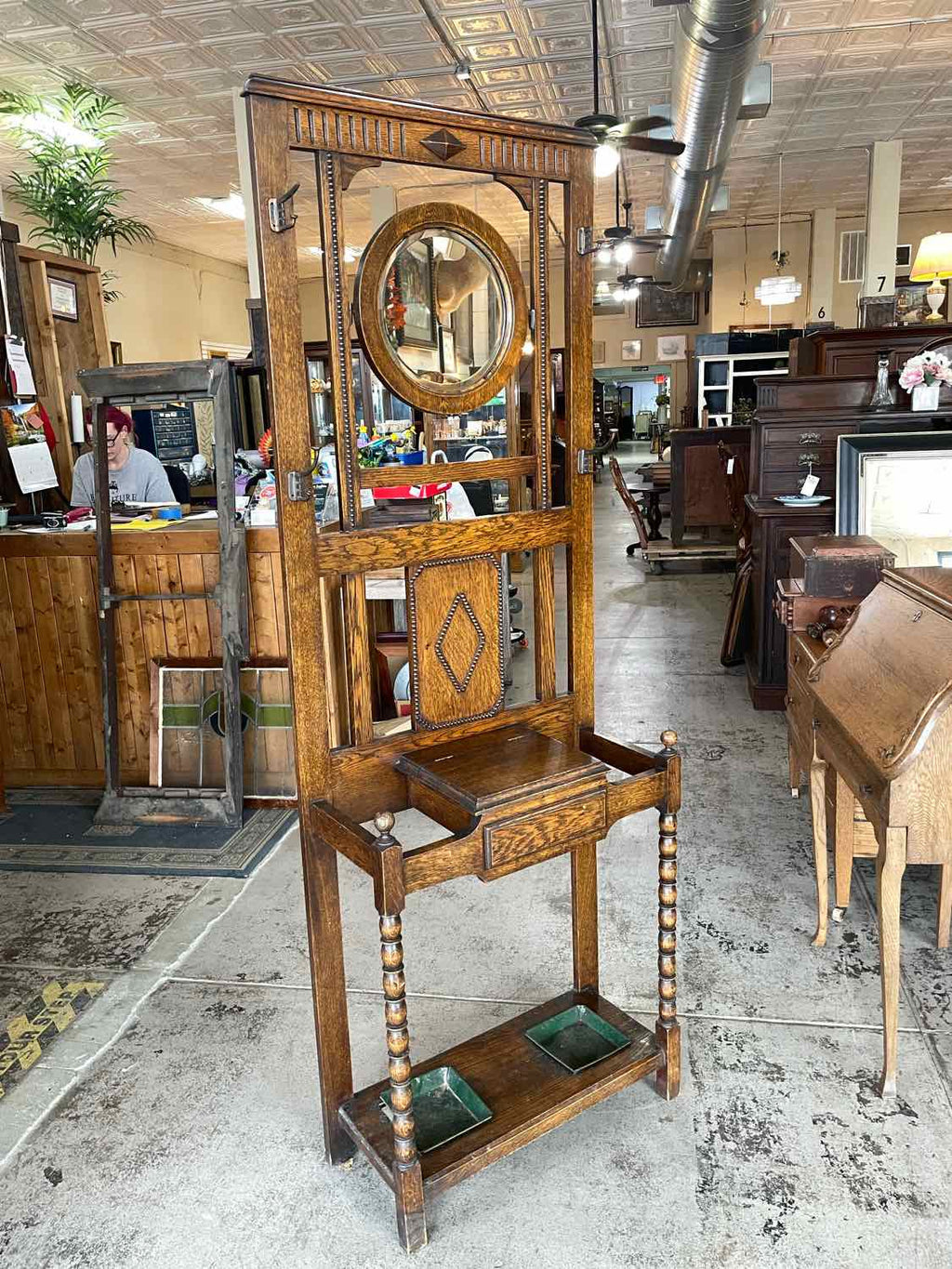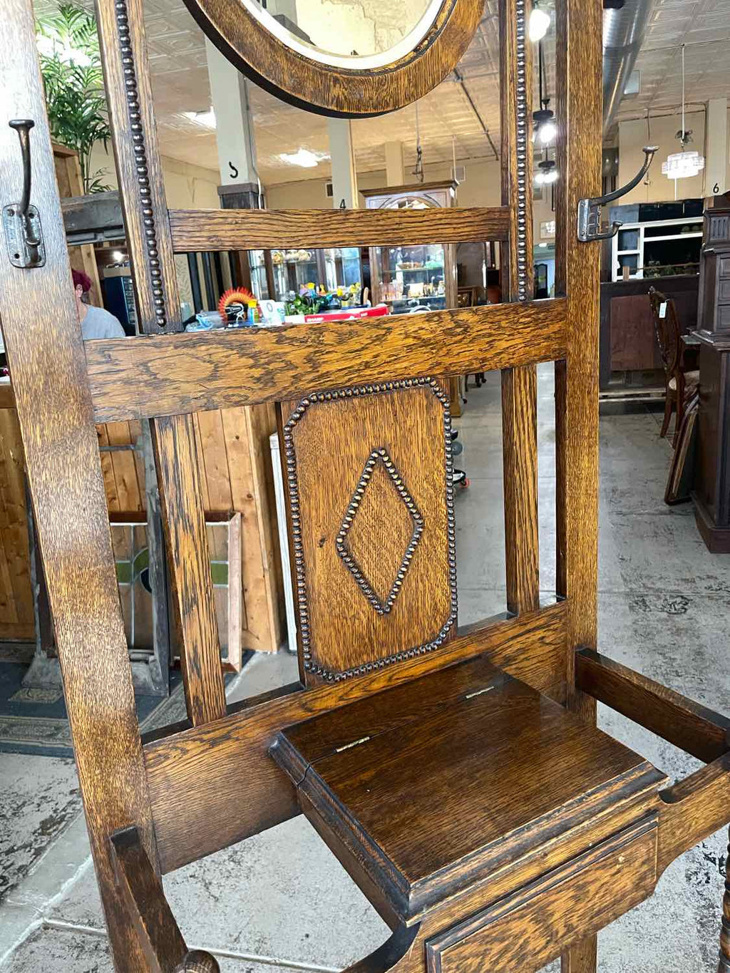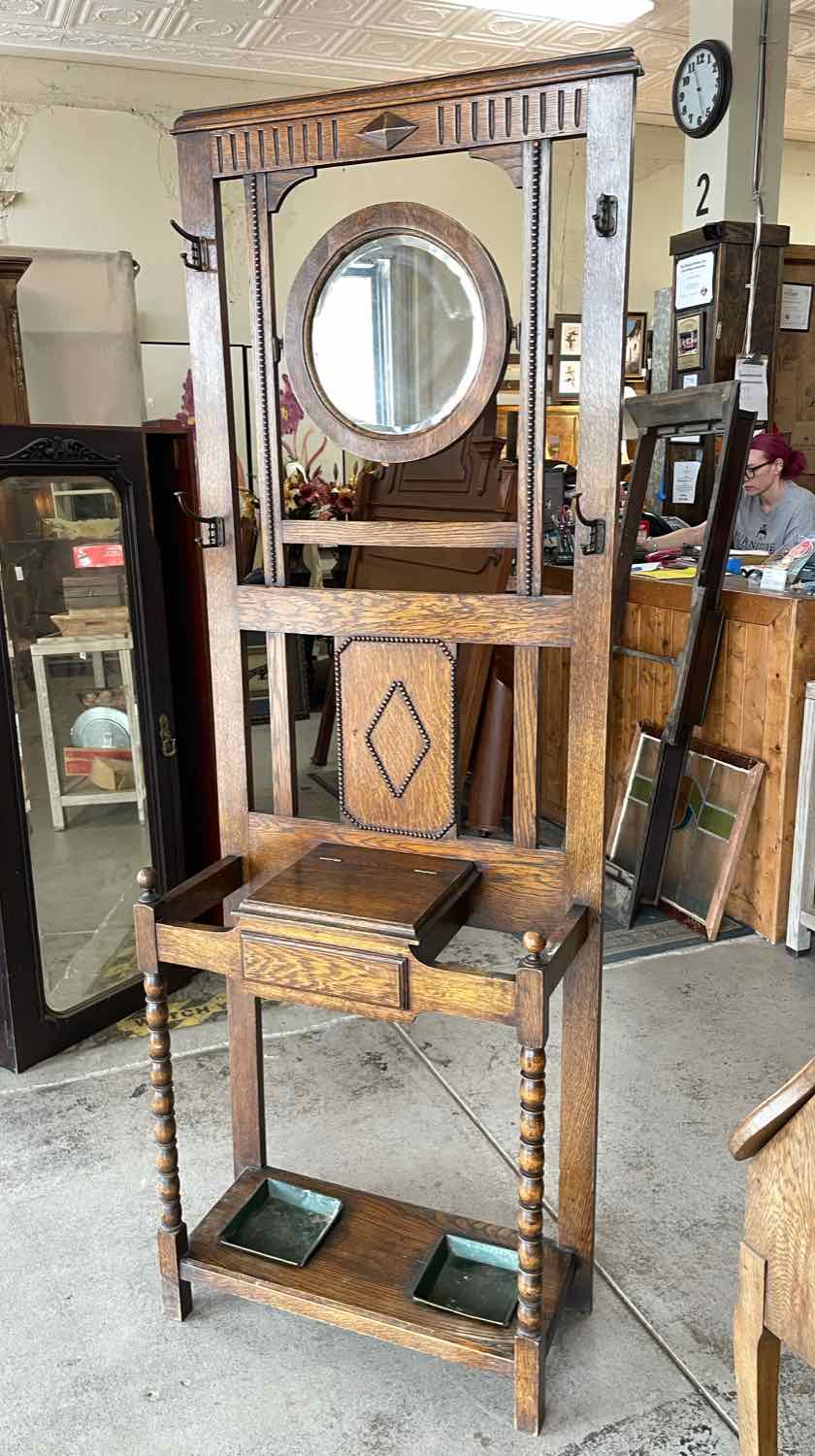 Antique English Oak Hall Tree w/ Umbrella Trays, 4 Double Hooks & Round Mirror - 74" Tall x 26" Wide x 11.5" Deep