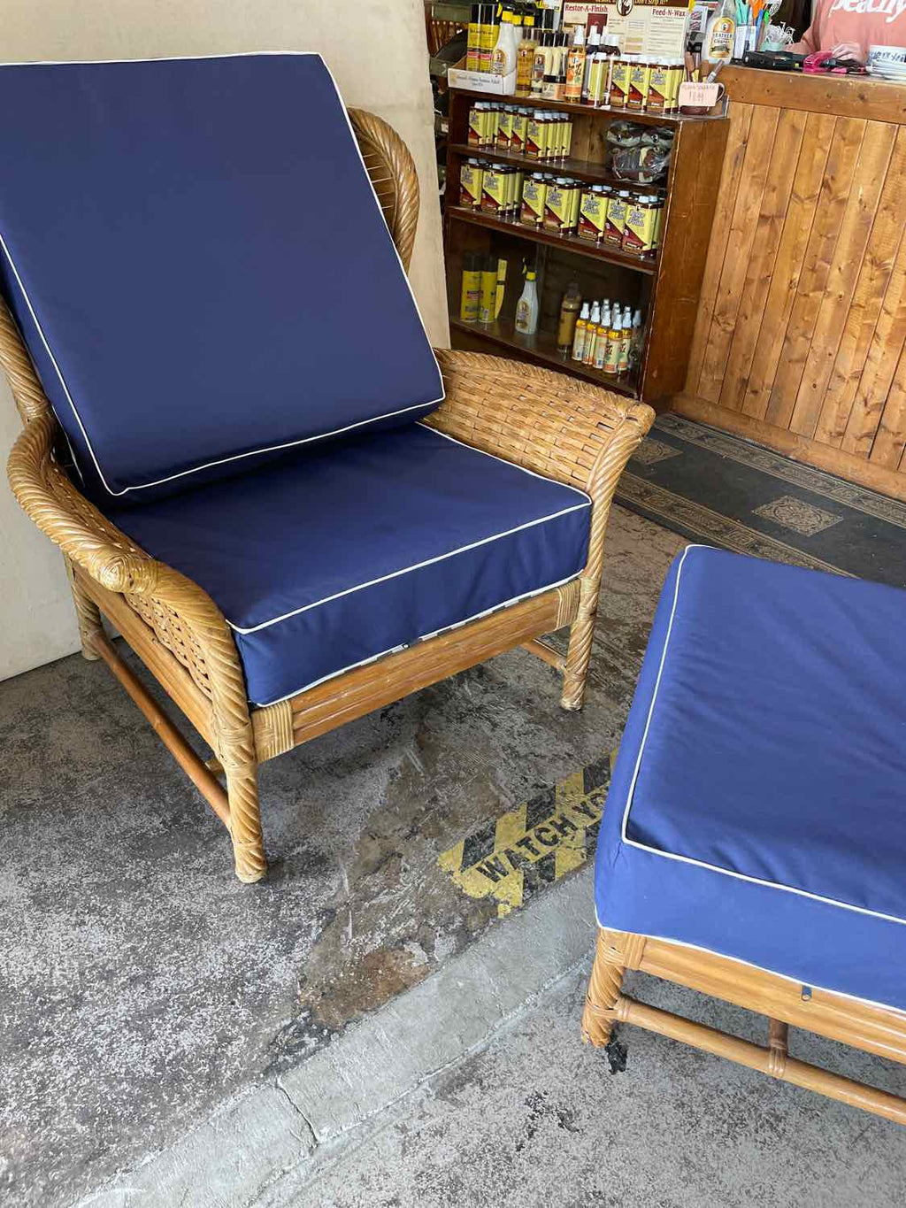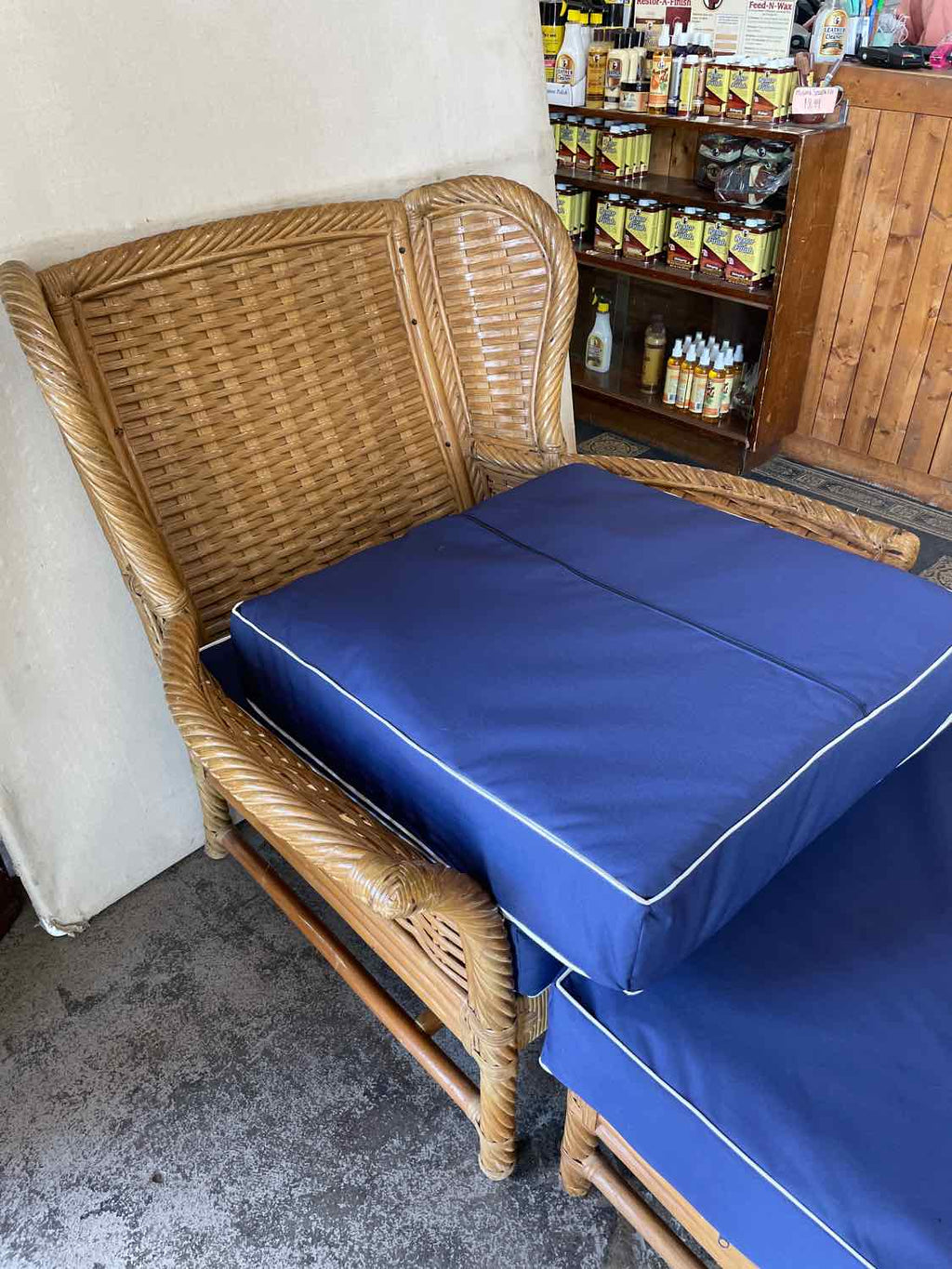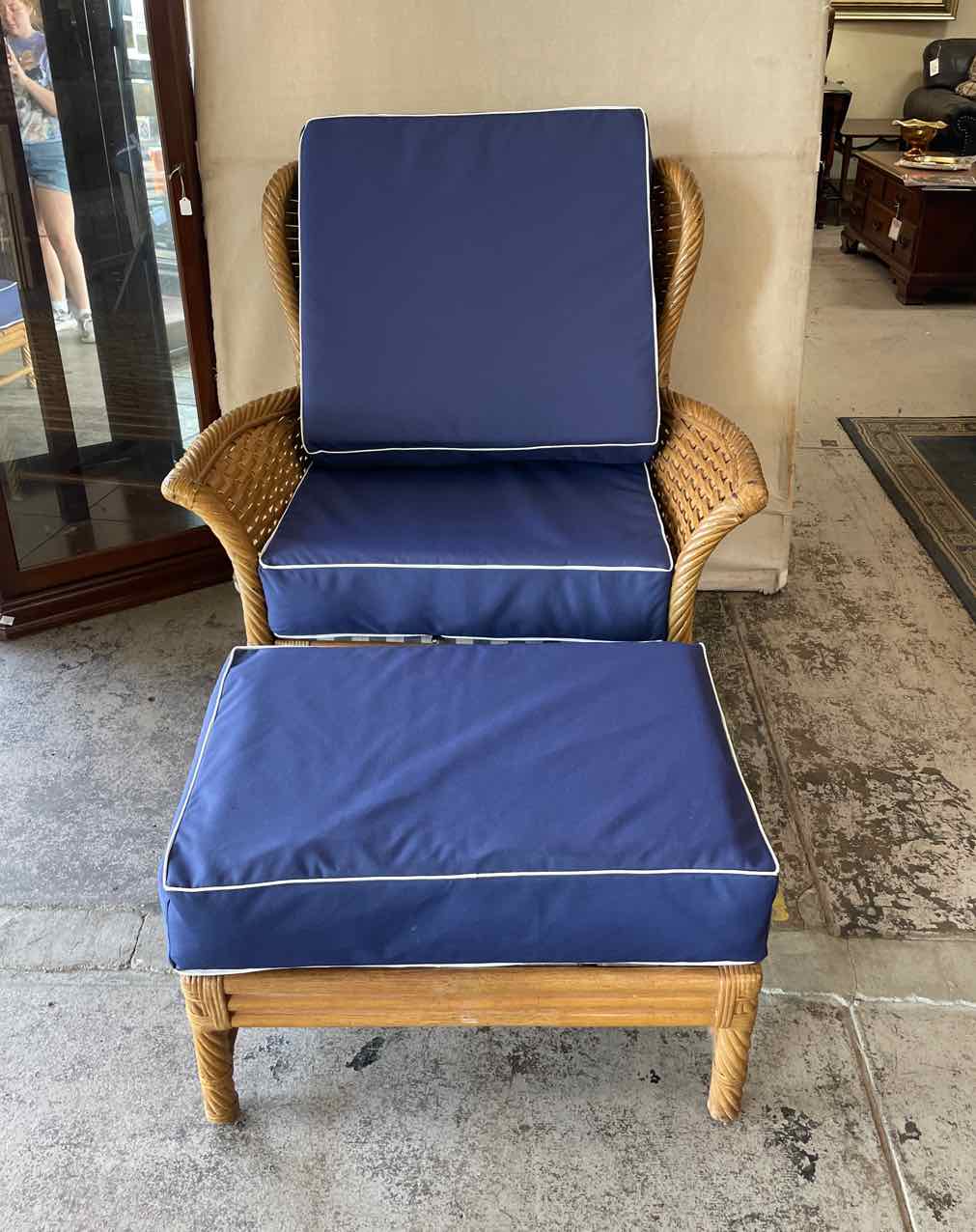 Lane Venture Bamboo Occasional Chair w/ Ottoman - Navy Blue Cusions - 41" Tall x 37" Wide x 28" Deep / 46.5" Deep w/ Ottoman