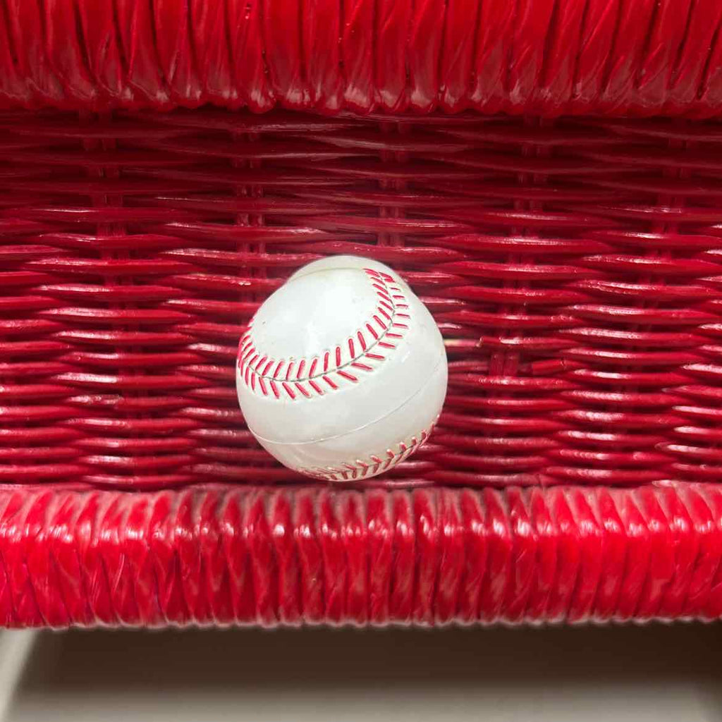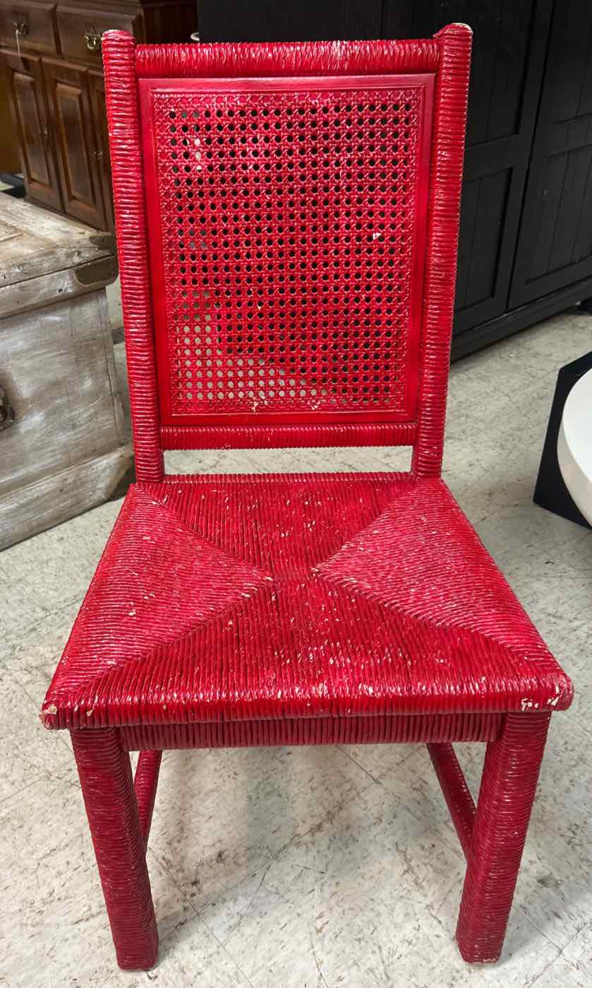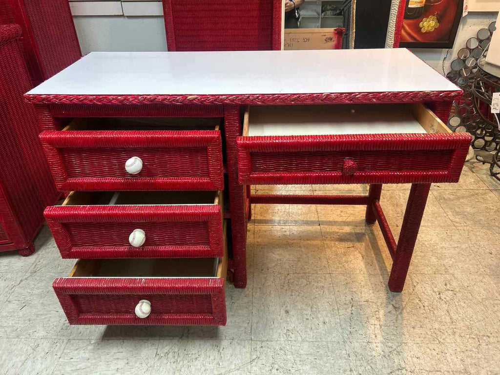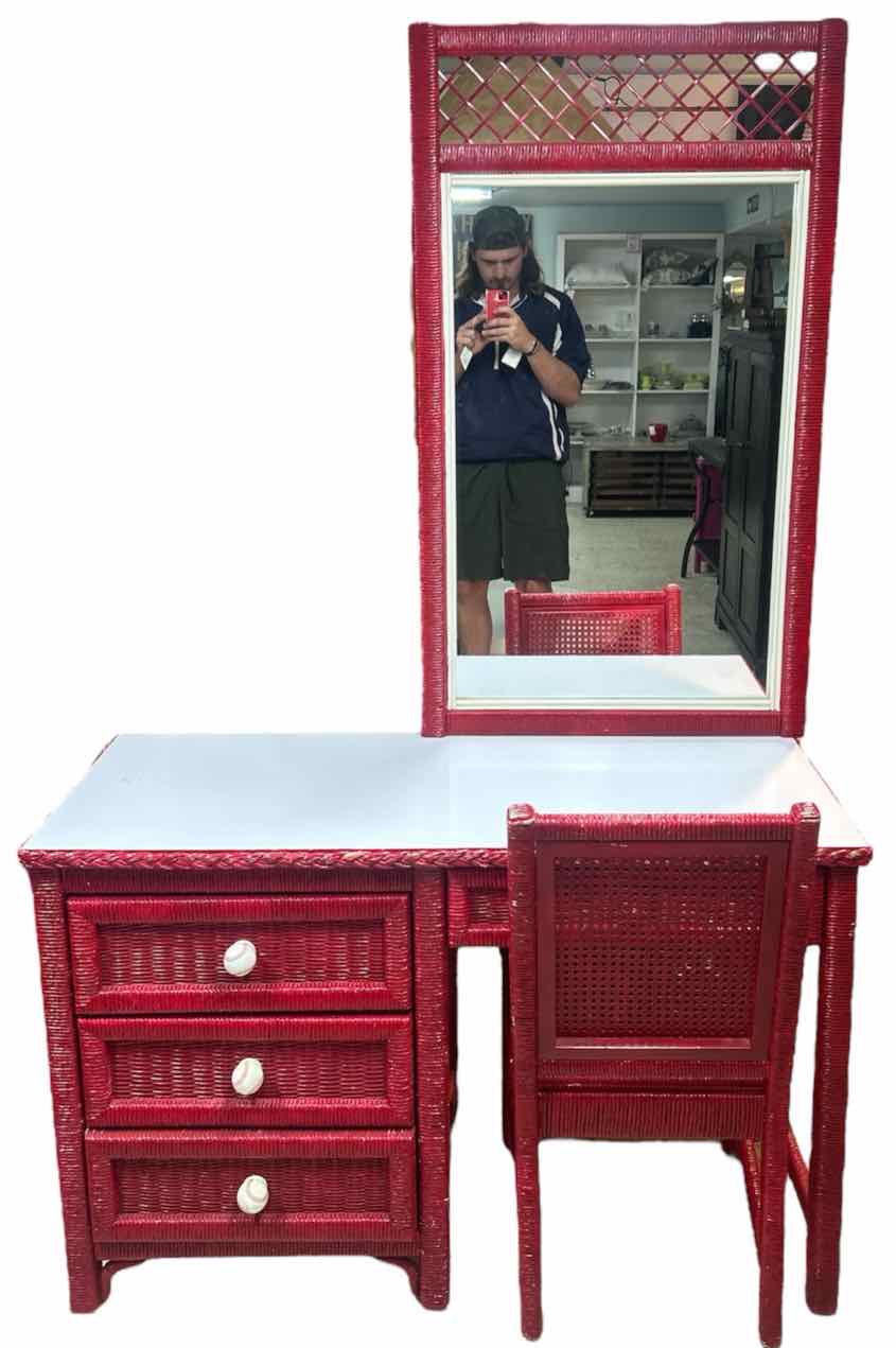 Red Painted Wicker Vanity w/ Mirror & Matching Chair - 30.5" Tall / 75.5" Tall w/ Mirror x 47" Wide x 19.5" Deep