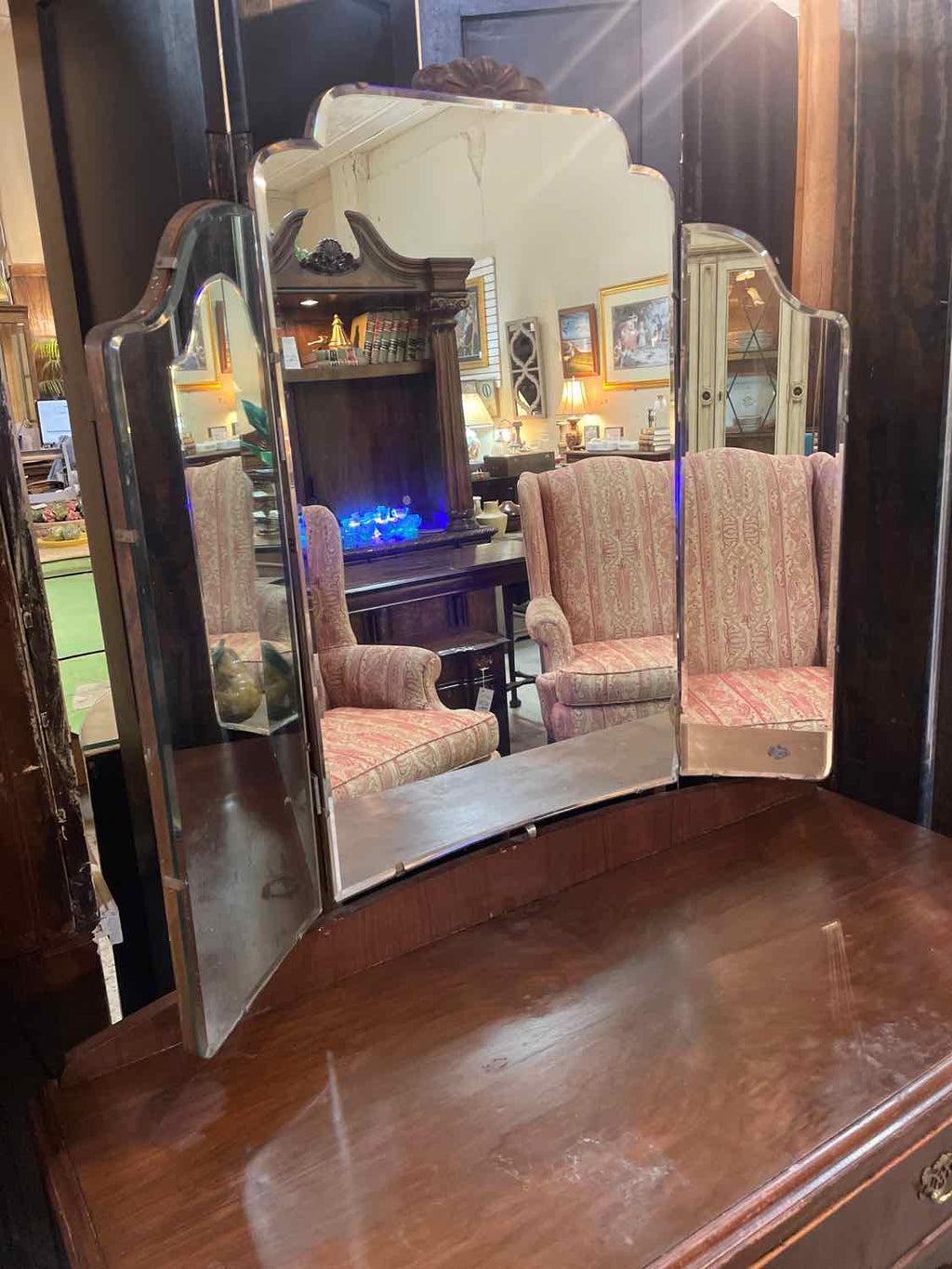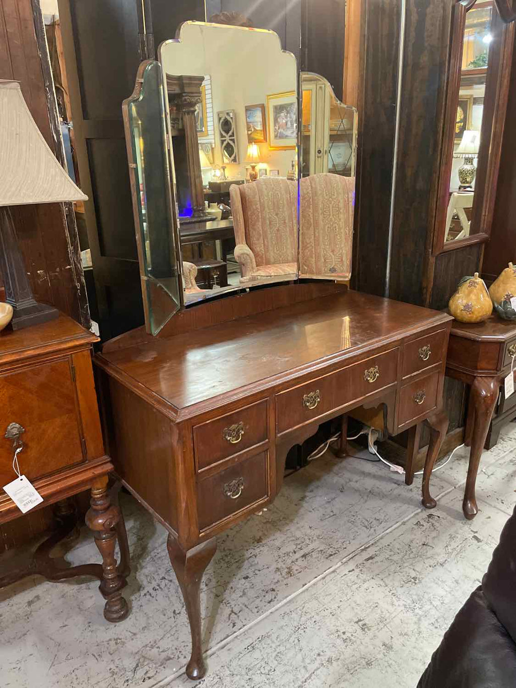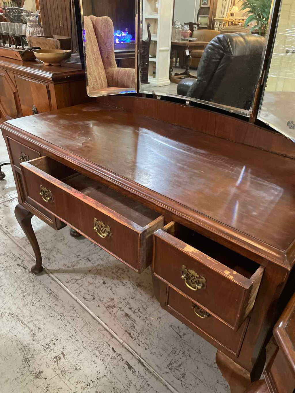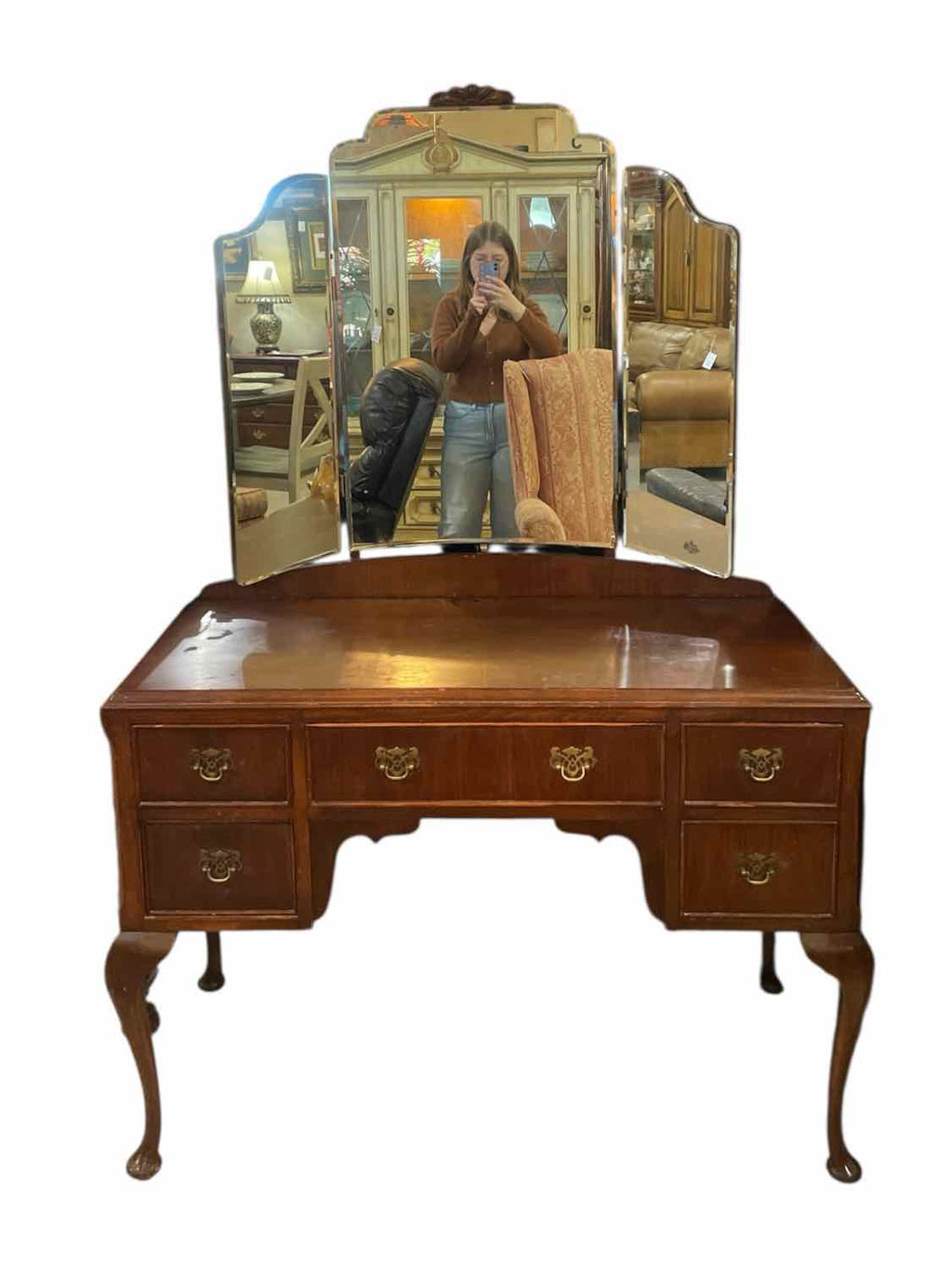 Antique Mahogany Finish Vanity w/ Triple Mirror & 5 Drawers - 65.5" Tall x 42.5" Wide x 18.5" Deep