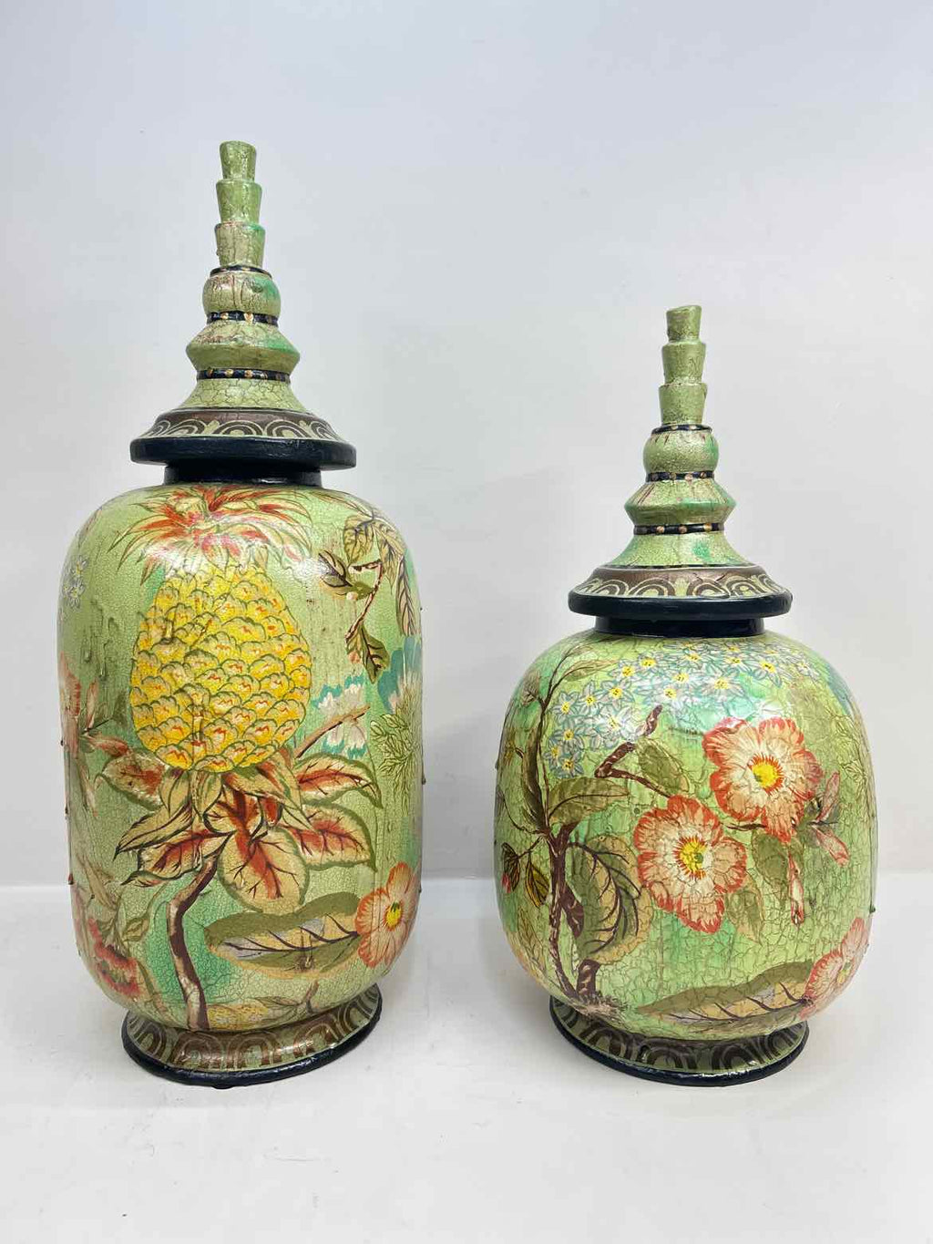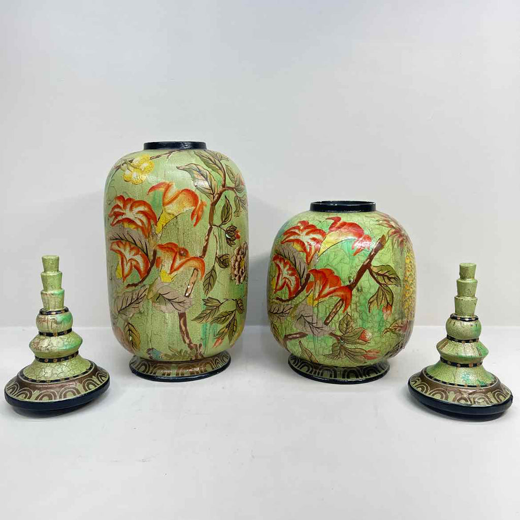 Set of 2 Green Floral Ginger Jars w/ Lids - 20" Tall