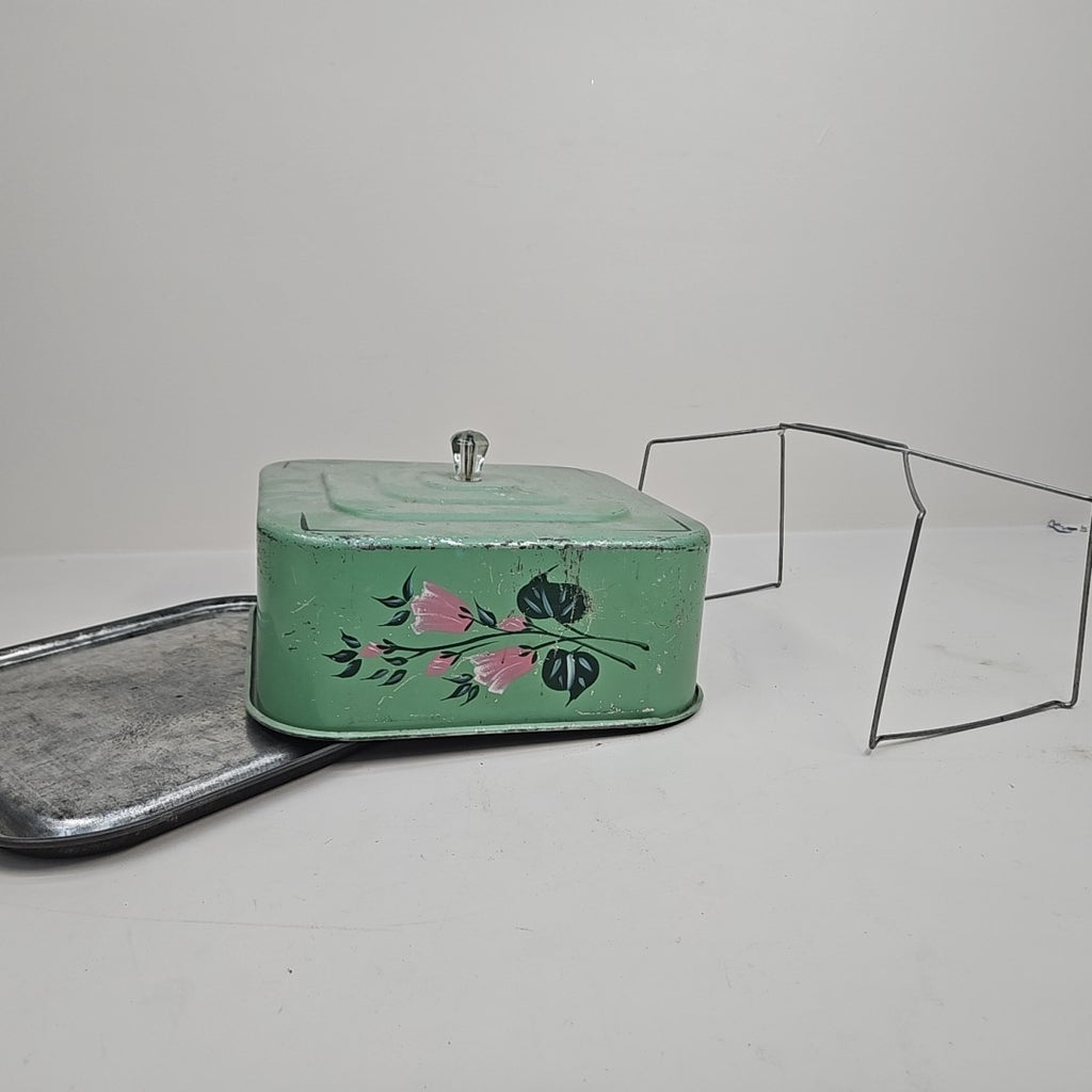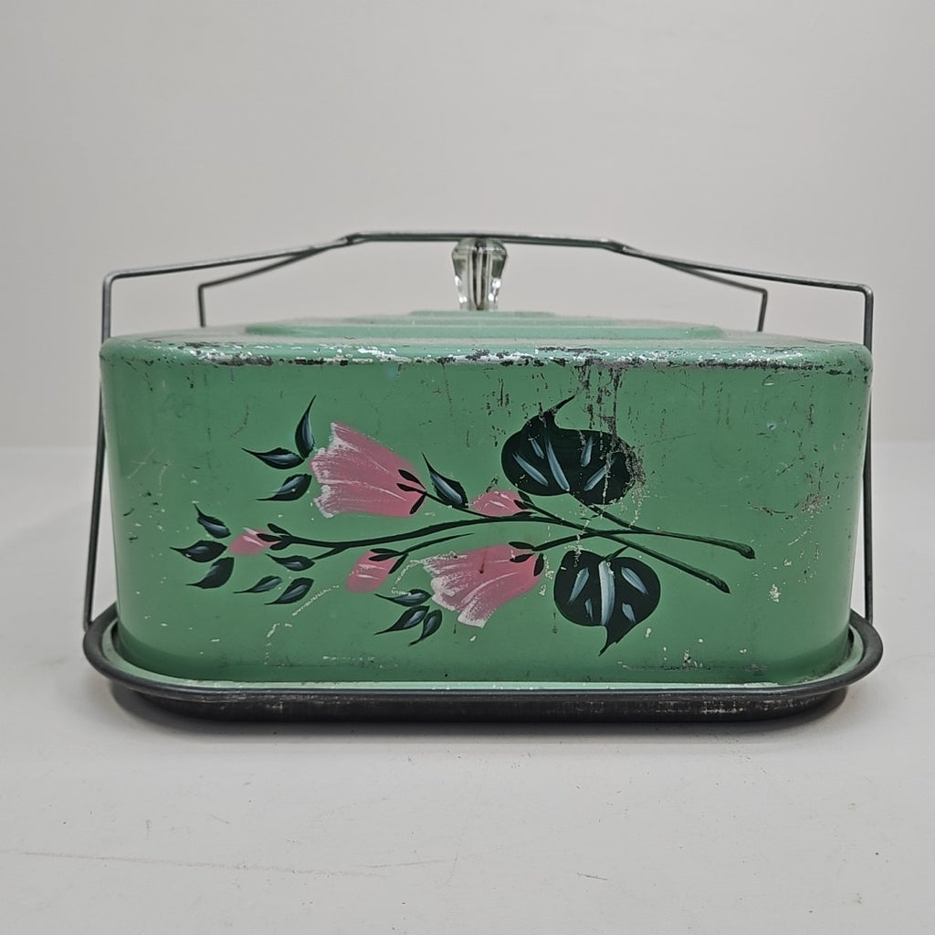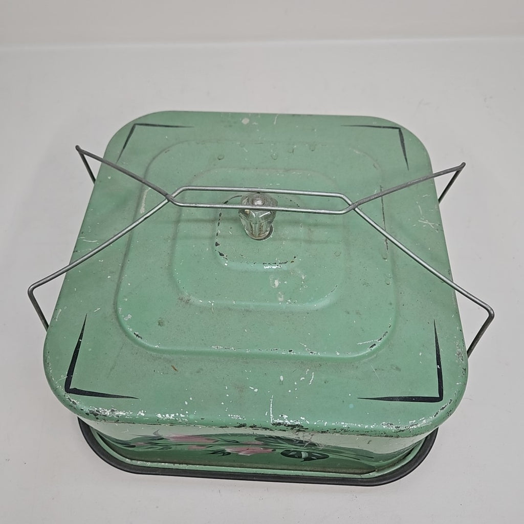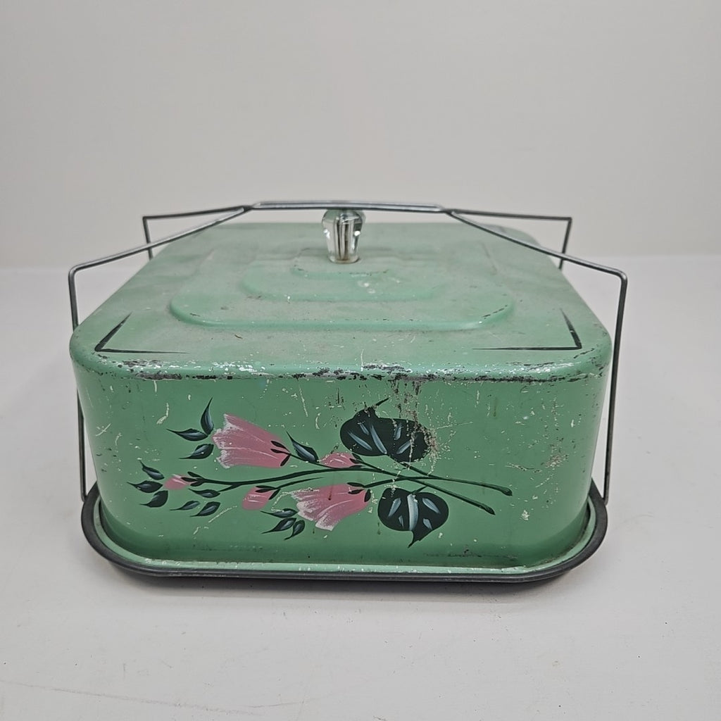 Vintage Mint Green Aluminum Cake Carrier with Floral Design - 7" Tall