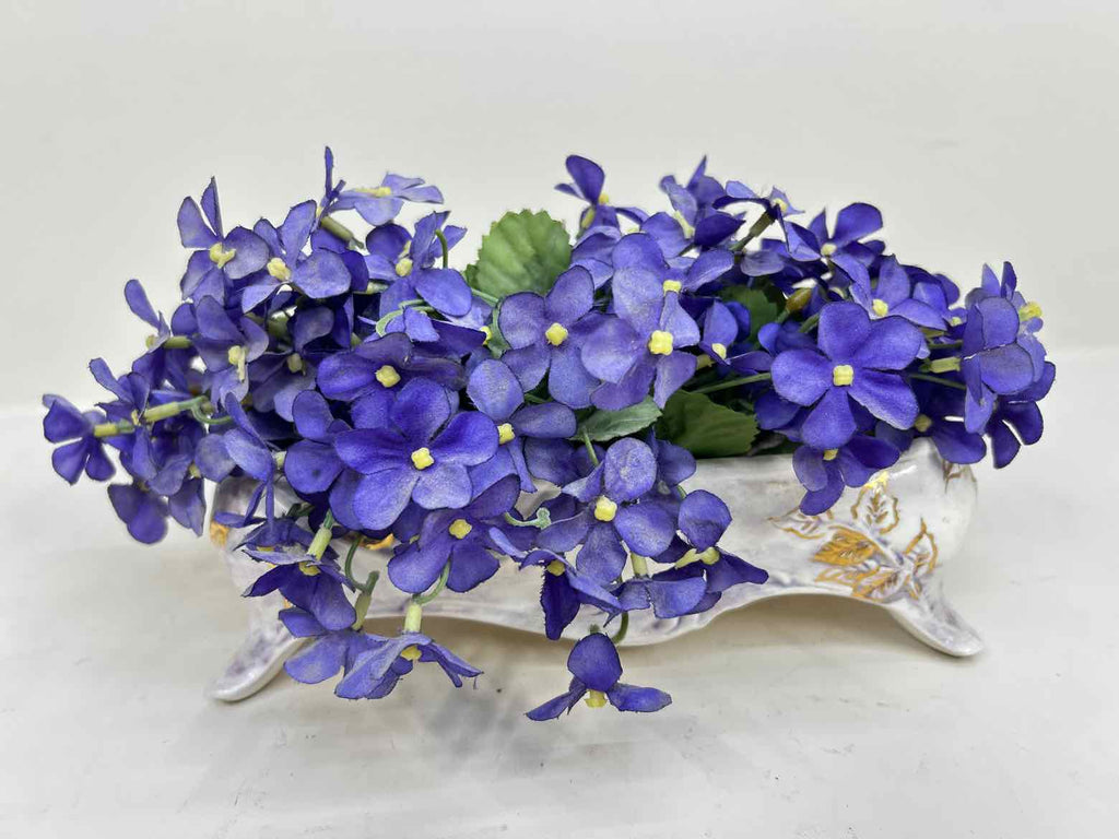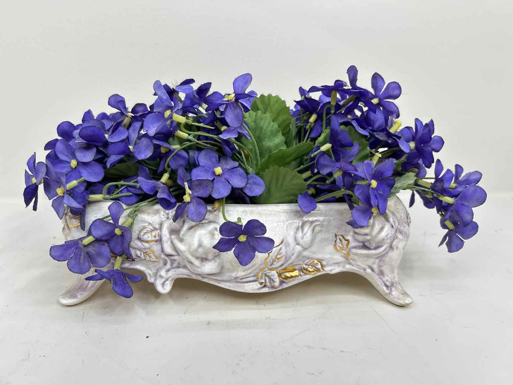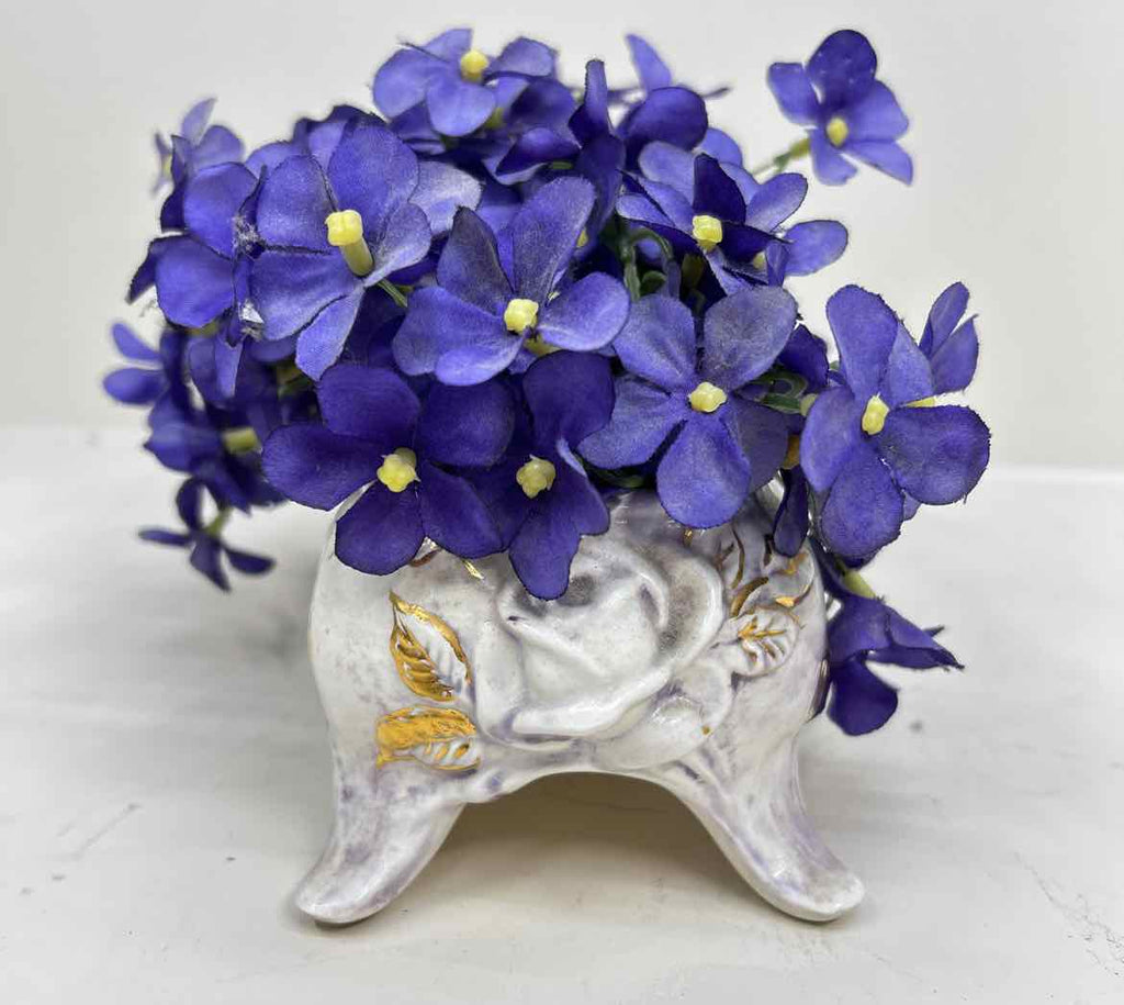 Ceramic Hand Painted Purple & Gold Planter w/ Faux Flowers - Signed Clara Olza Kerrville, TX 1964 - 6" Tall x 10" Wide