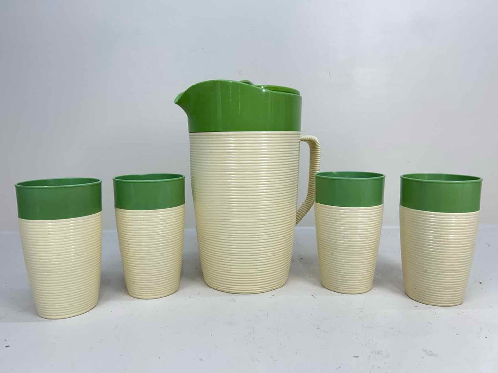 Vintage Raffiaware Green Thermo-Temp Pitcher & 4 Cups - 9.5" Tall x 7" Wide