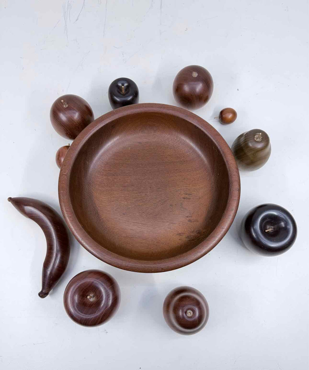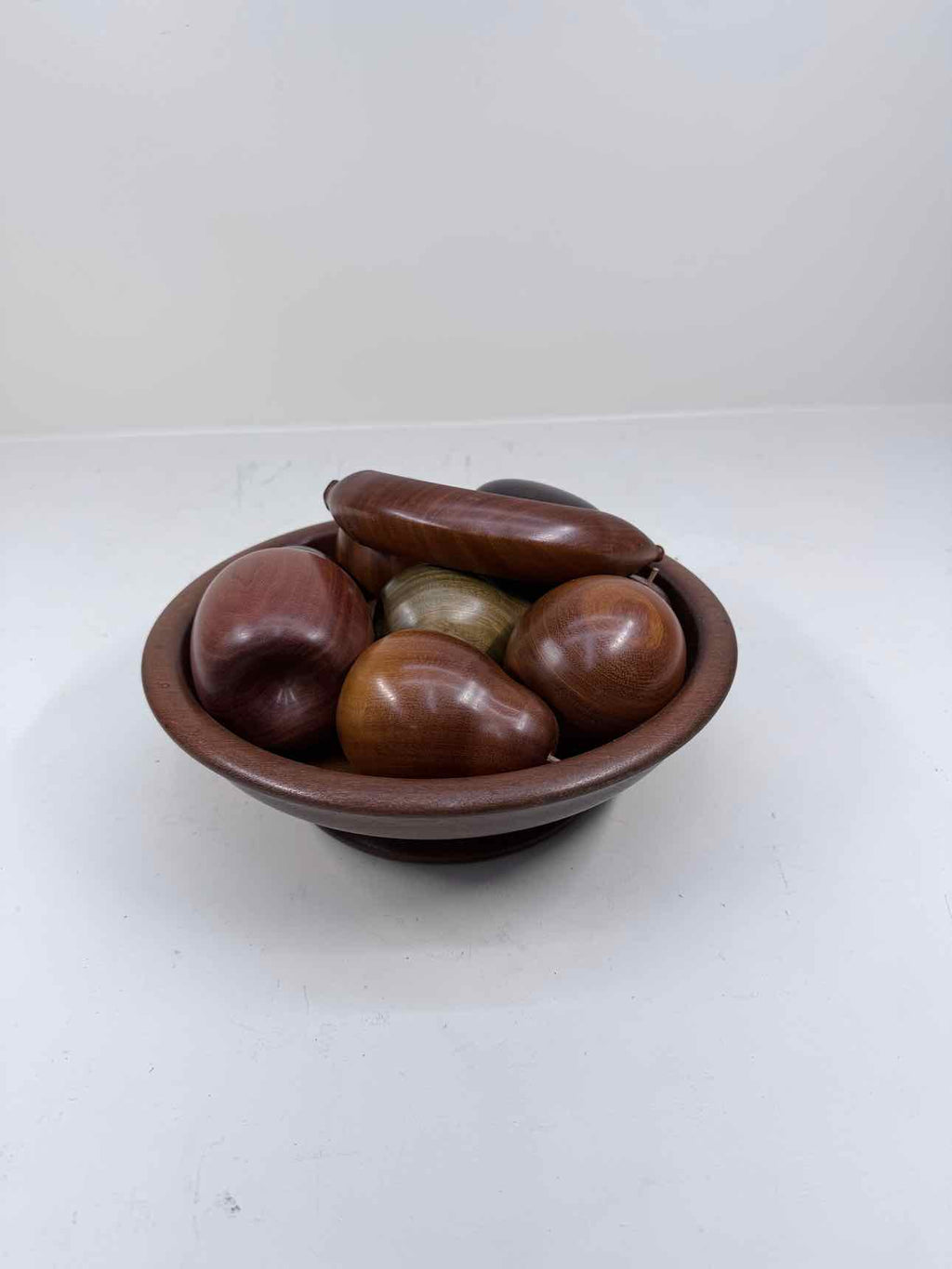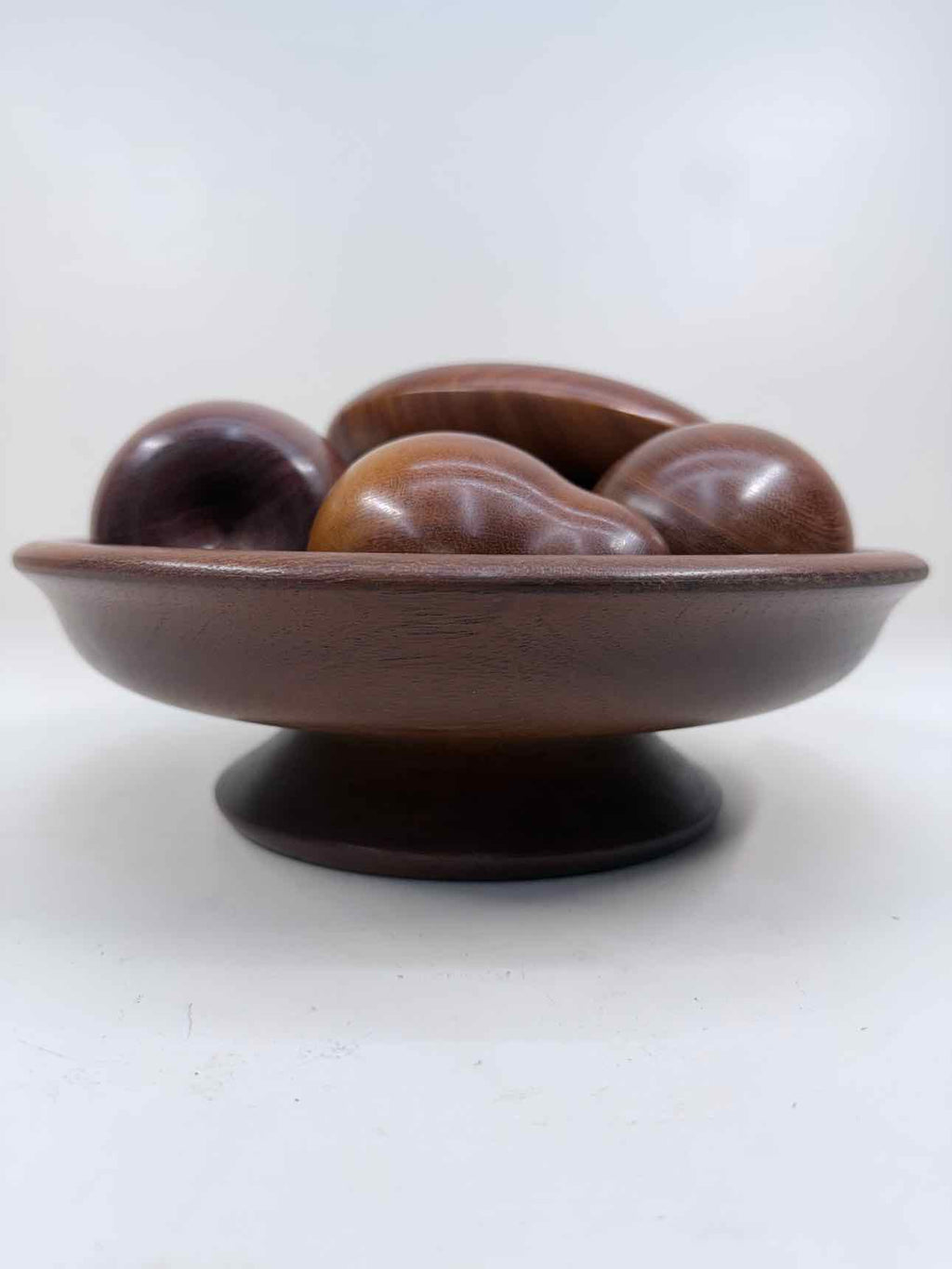 Mid Century Carved Wooden Fruit in Wood Bowl - 10.5" Wide