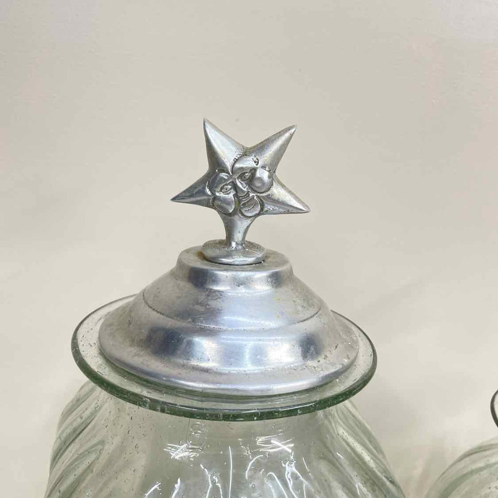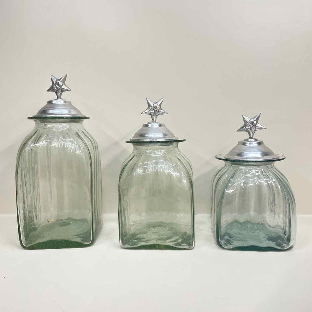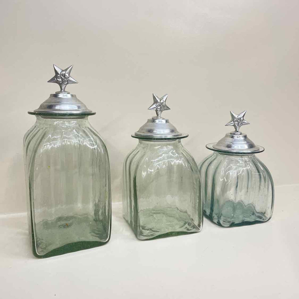 Set of 3 Clear Glass Canisters w/ Star Pewter Lids - 13.5" Tall
