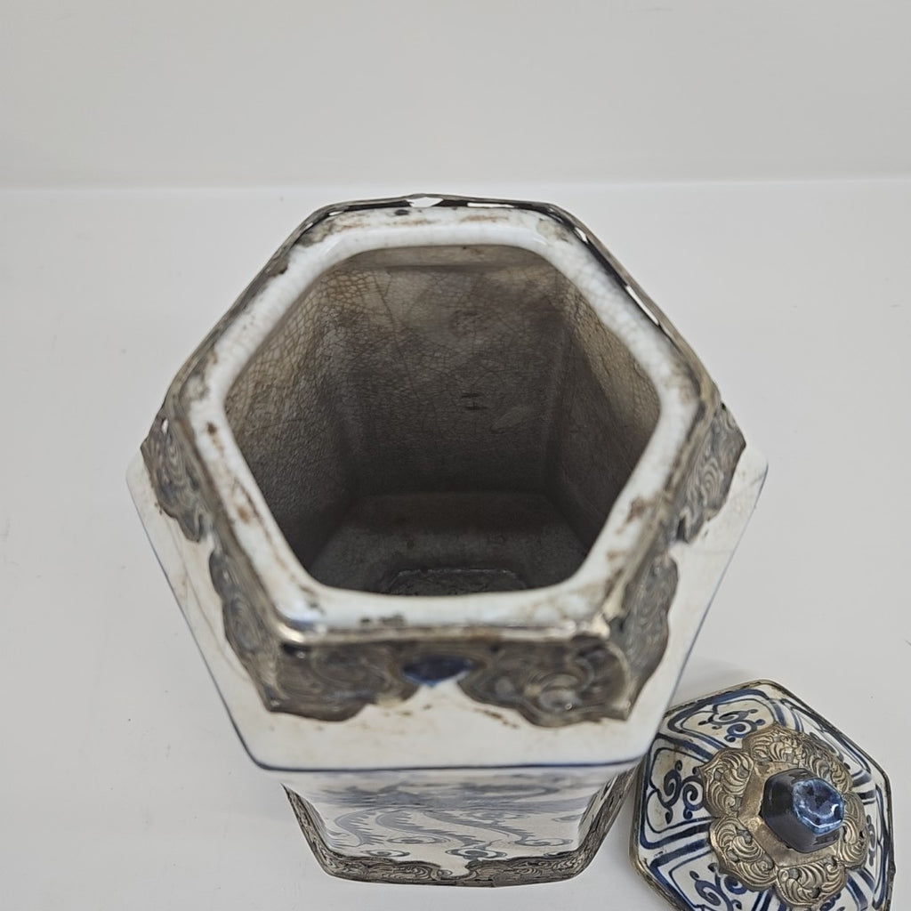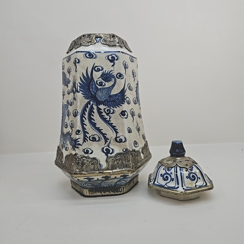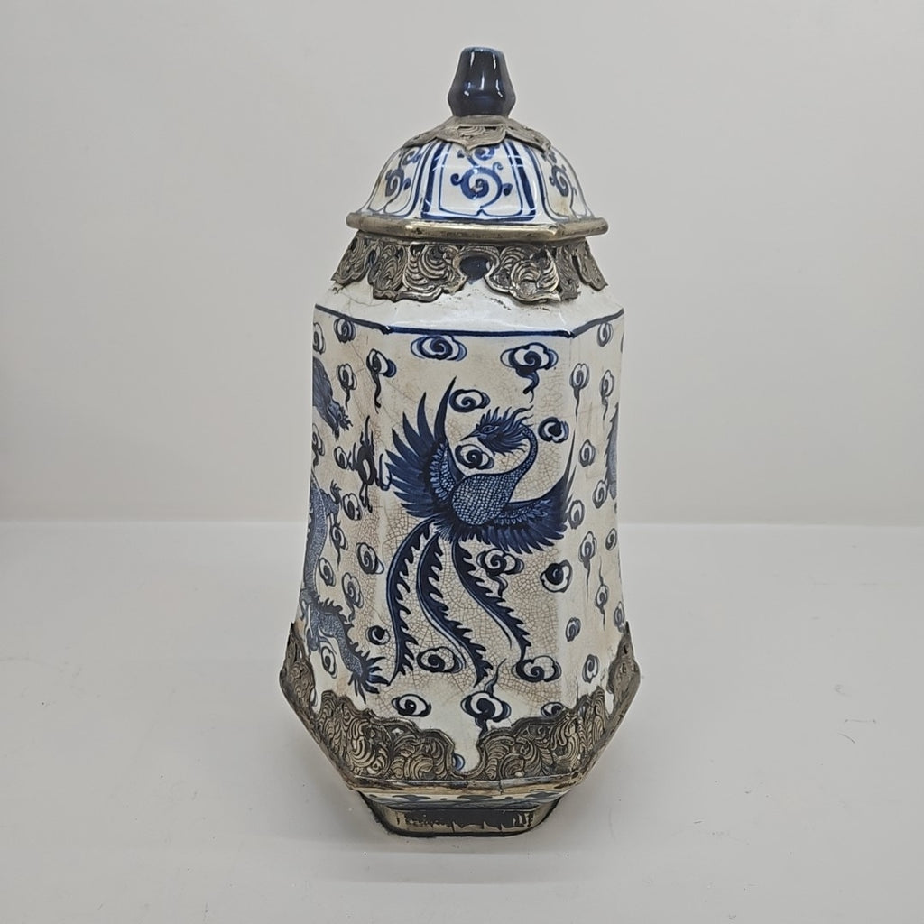 Vintage Blue & White Porcelain Jar/Canister w Lid - 15" Tall