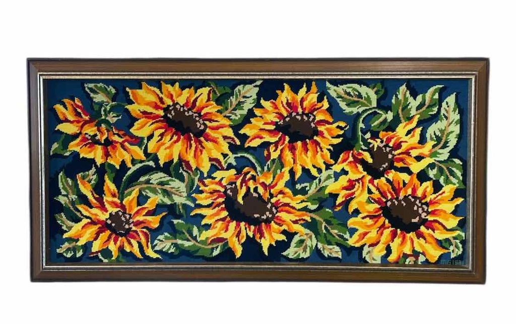 Vintage Wood Framed Needlepoint Tapestry - Sunflowers - 25" Tall x 49.5" Wide