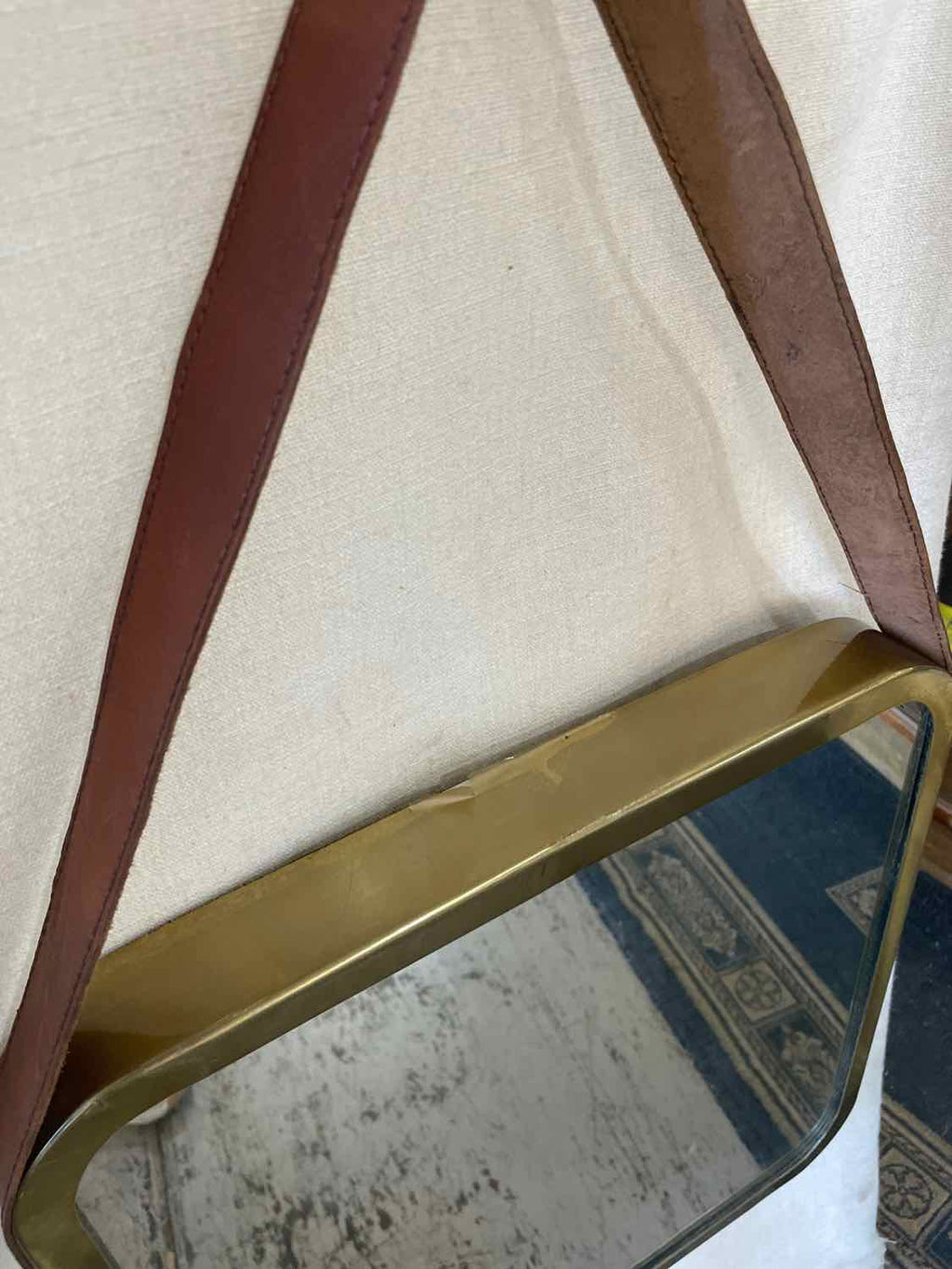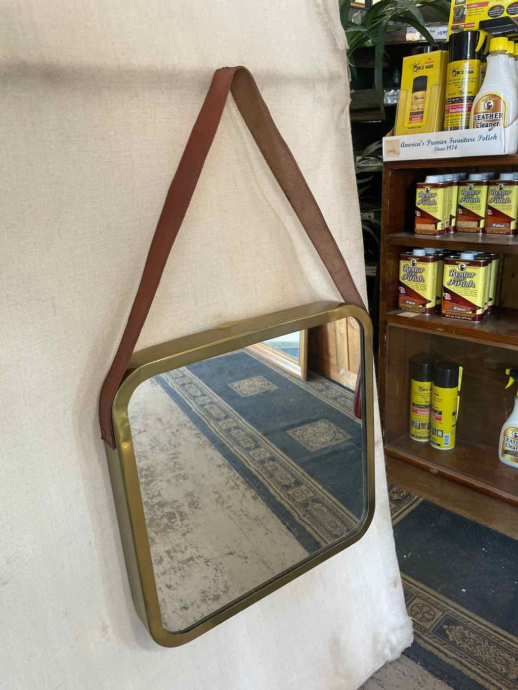 Gold Framed Mirror w/ Leather Strap - 16.5" Tall x 16.5" Wide