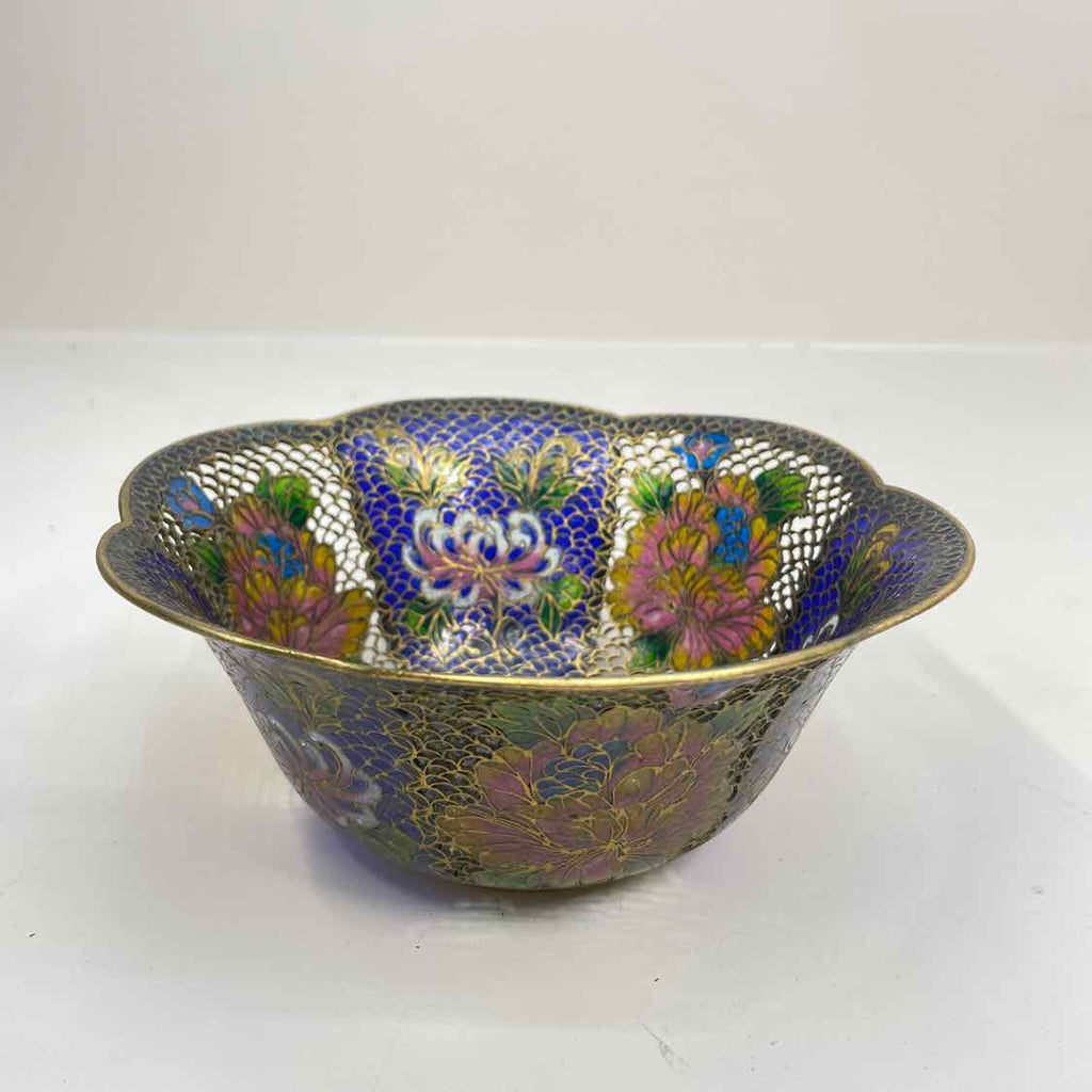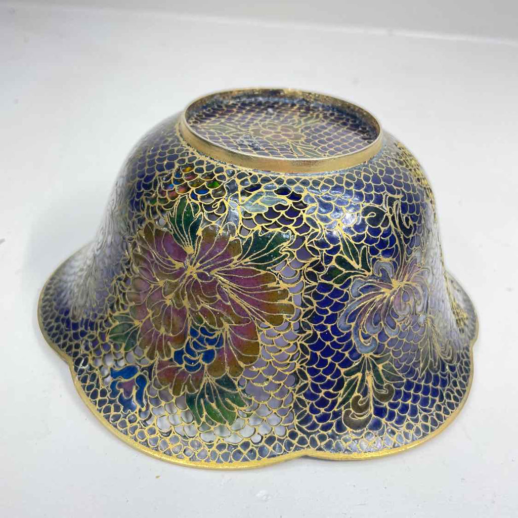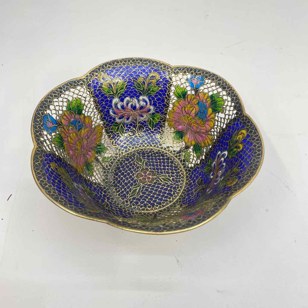 Vintage Plique A Jour Bowl with Cobalt Blue Finish - Stained Glass Look, Cobalt Blue w Pink Flowers - Roughly 2.5" Tall x 6.5" Wide