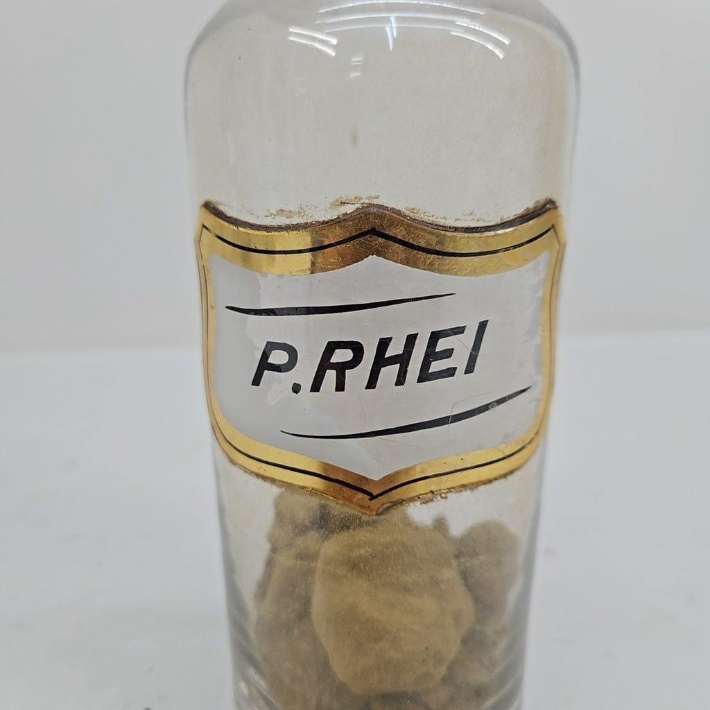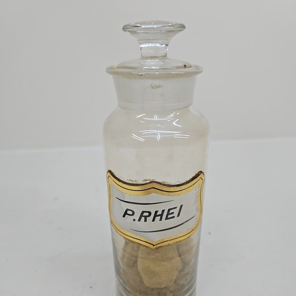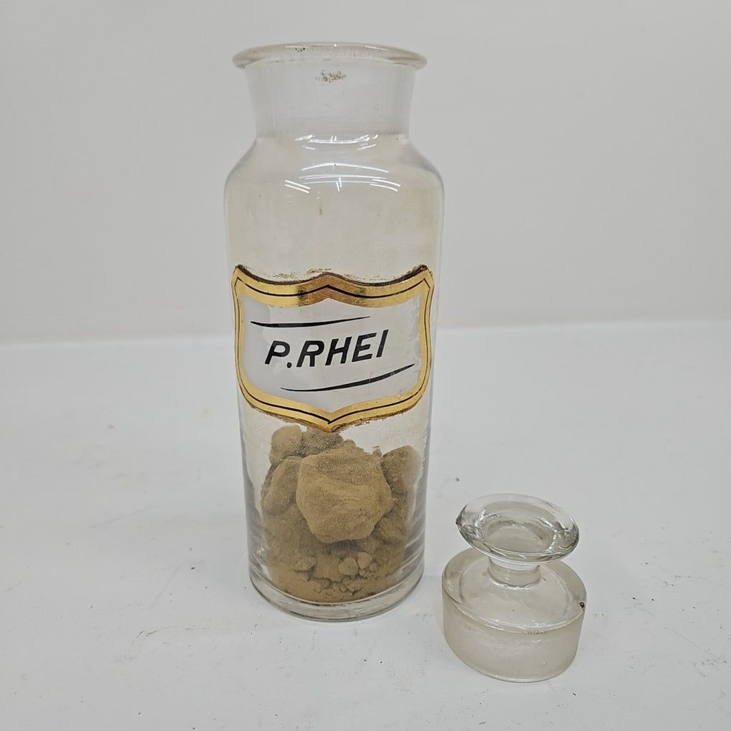 Antique Apothecary Jar with Glass Label "P.Rhei" - Pharmacy Bottle with Stopper - 8.5.5" Tall