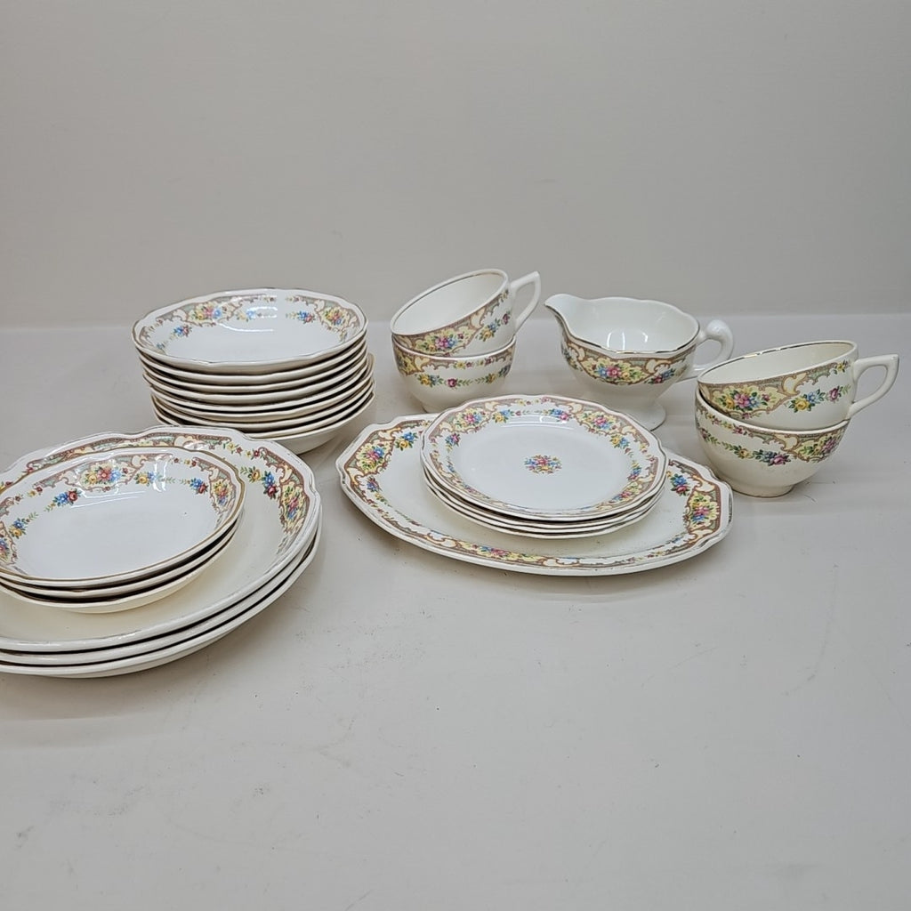 25 Piece China - Mount Clemens Pottery - "Mildred" Pink, Blue & Yellow Floral - 4 Tea Cups, 4 Saucers, 3 Dessert Bowls, 9 Bowls, 3 Vegetable Bowls, Creamer, Oval Platter