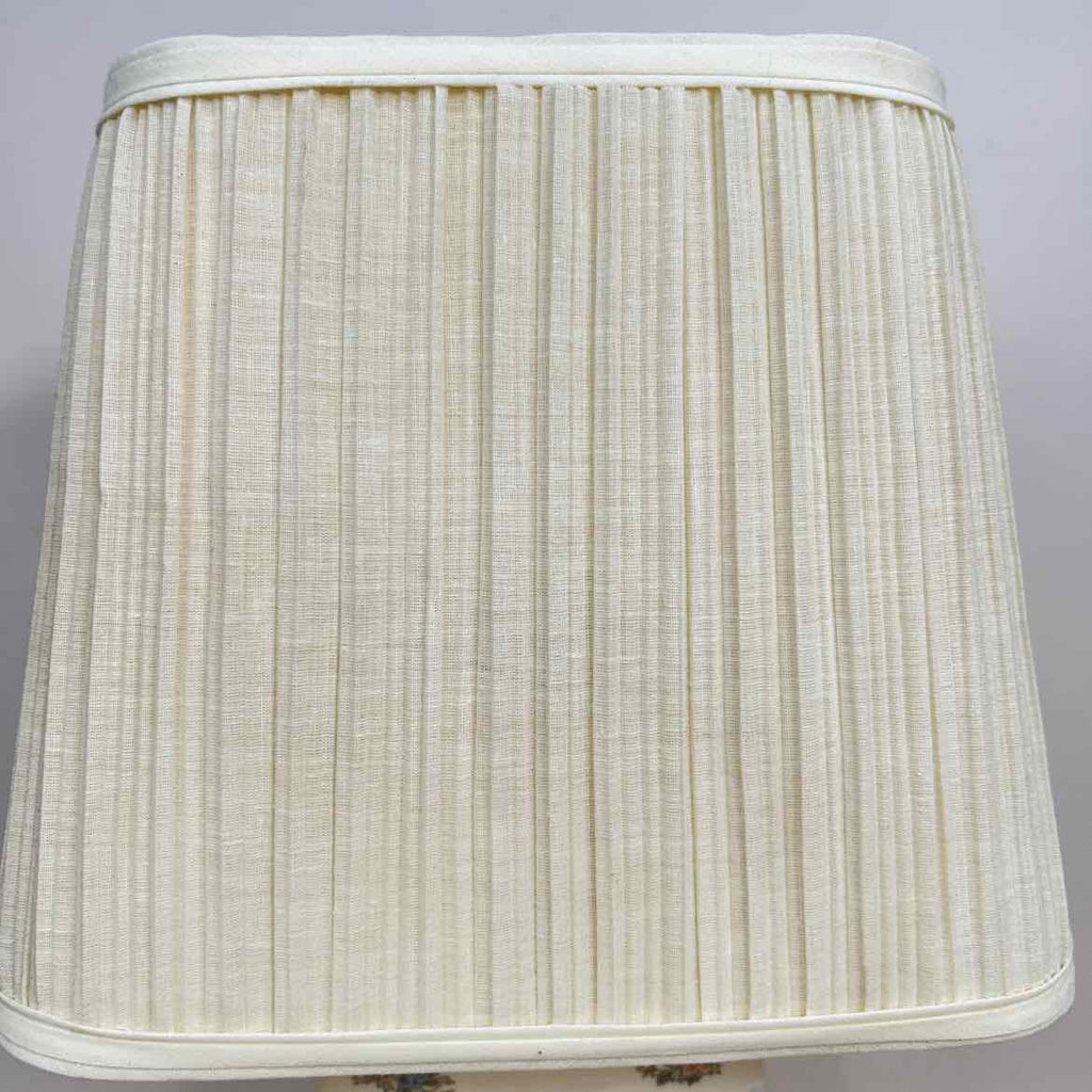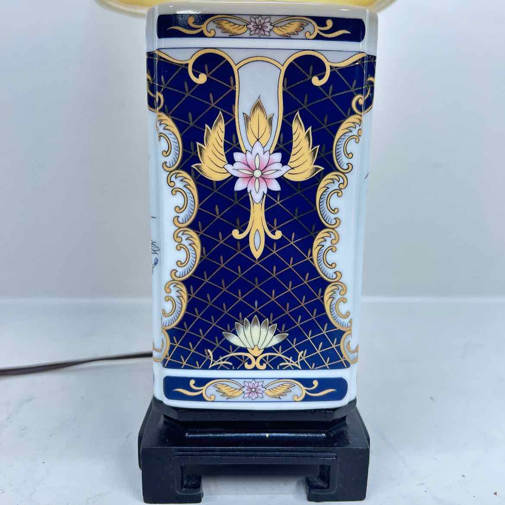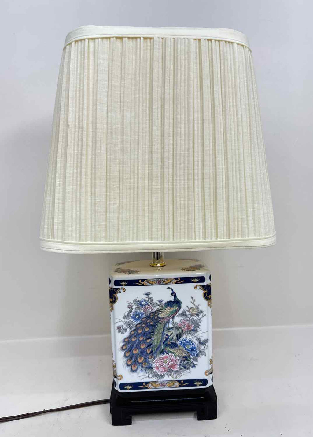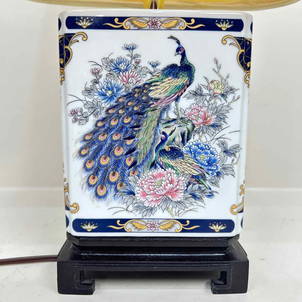 Vintage Petite Porcelain Table Lamp w/ Wood Base & Peacock Design - 18.5" Tall