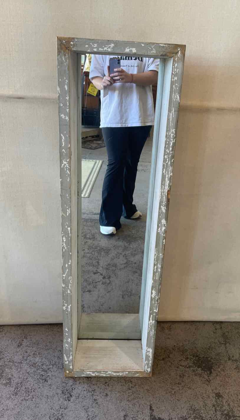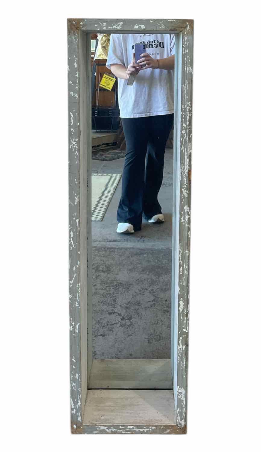 Distressed Grey Wood Shelf w/ Mirror Back - 44.5" Tall x 13" Wide x 6" Deep