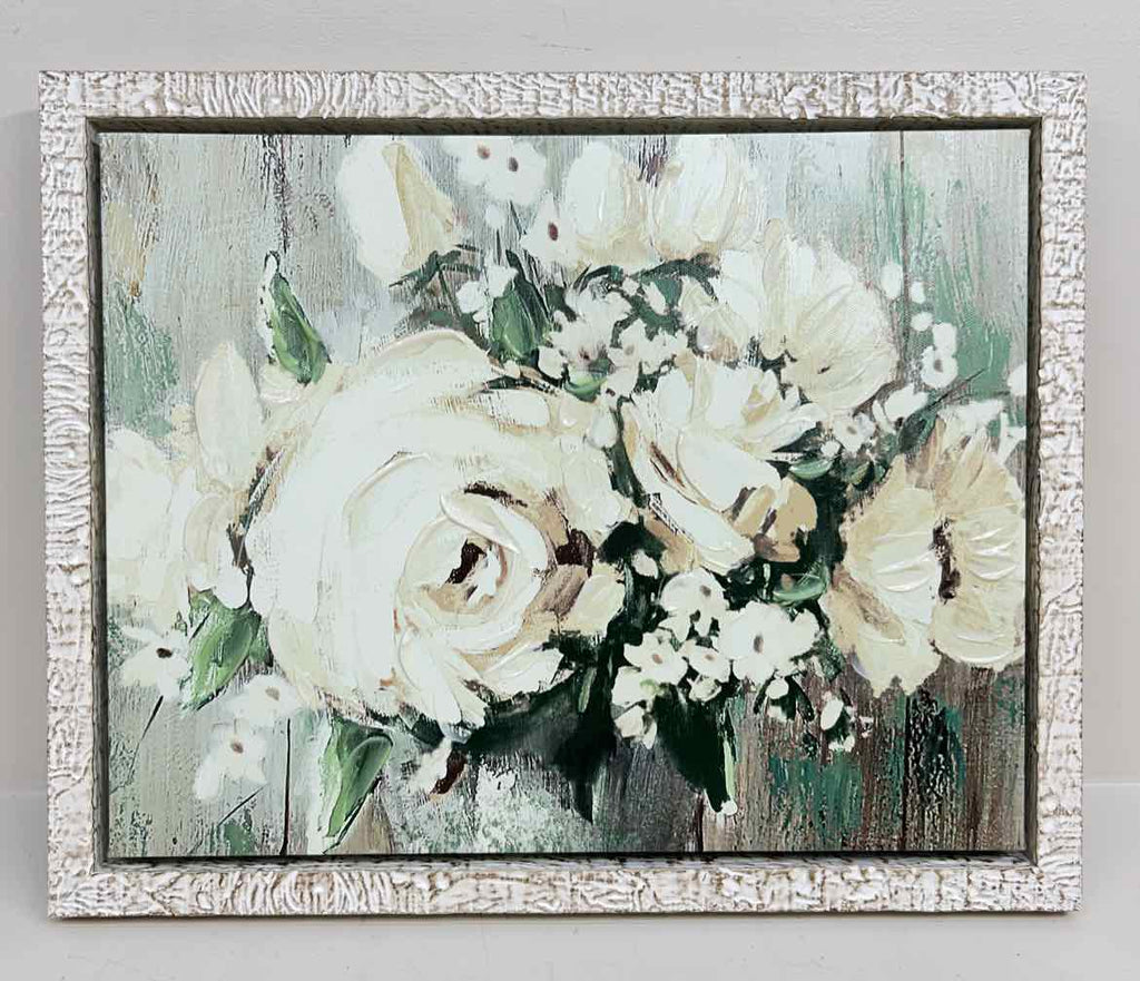 White Floral Canvas Print on Distressed White Frame - 13" x 16"