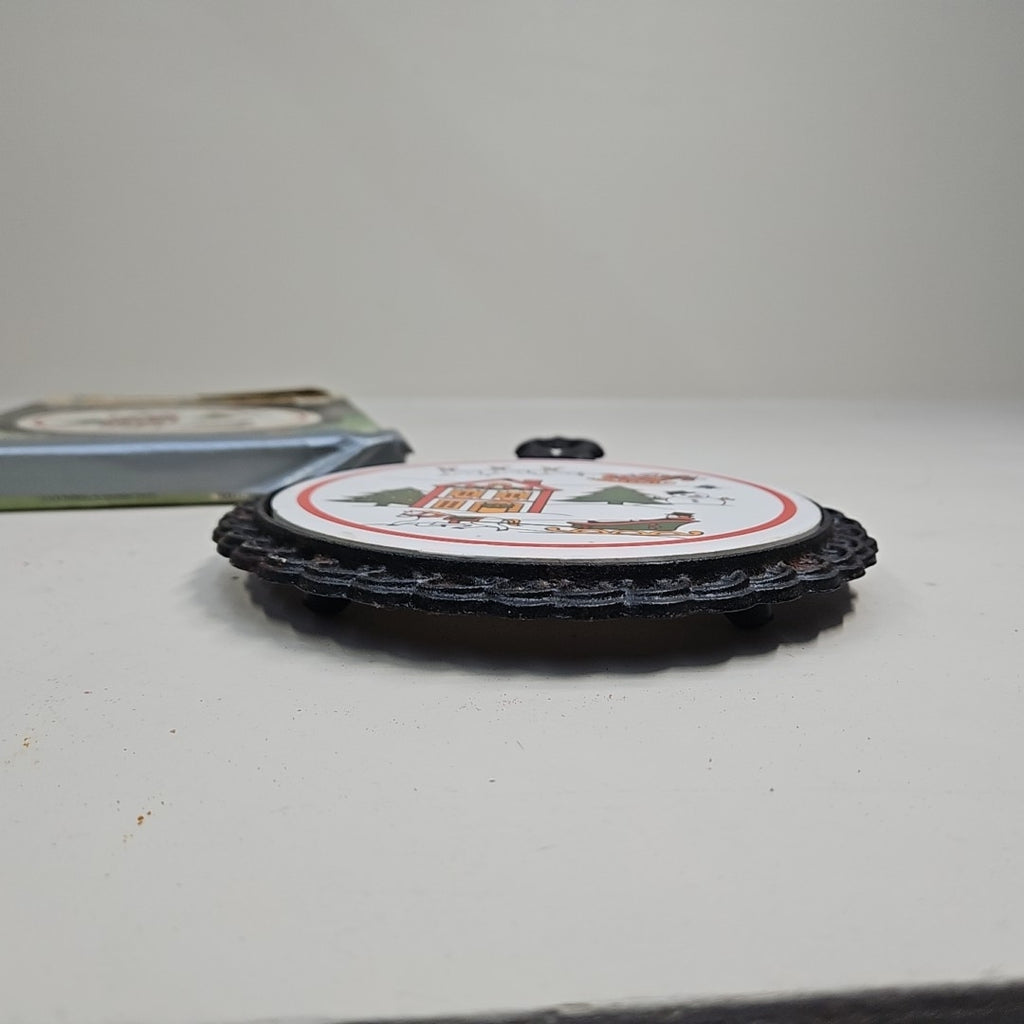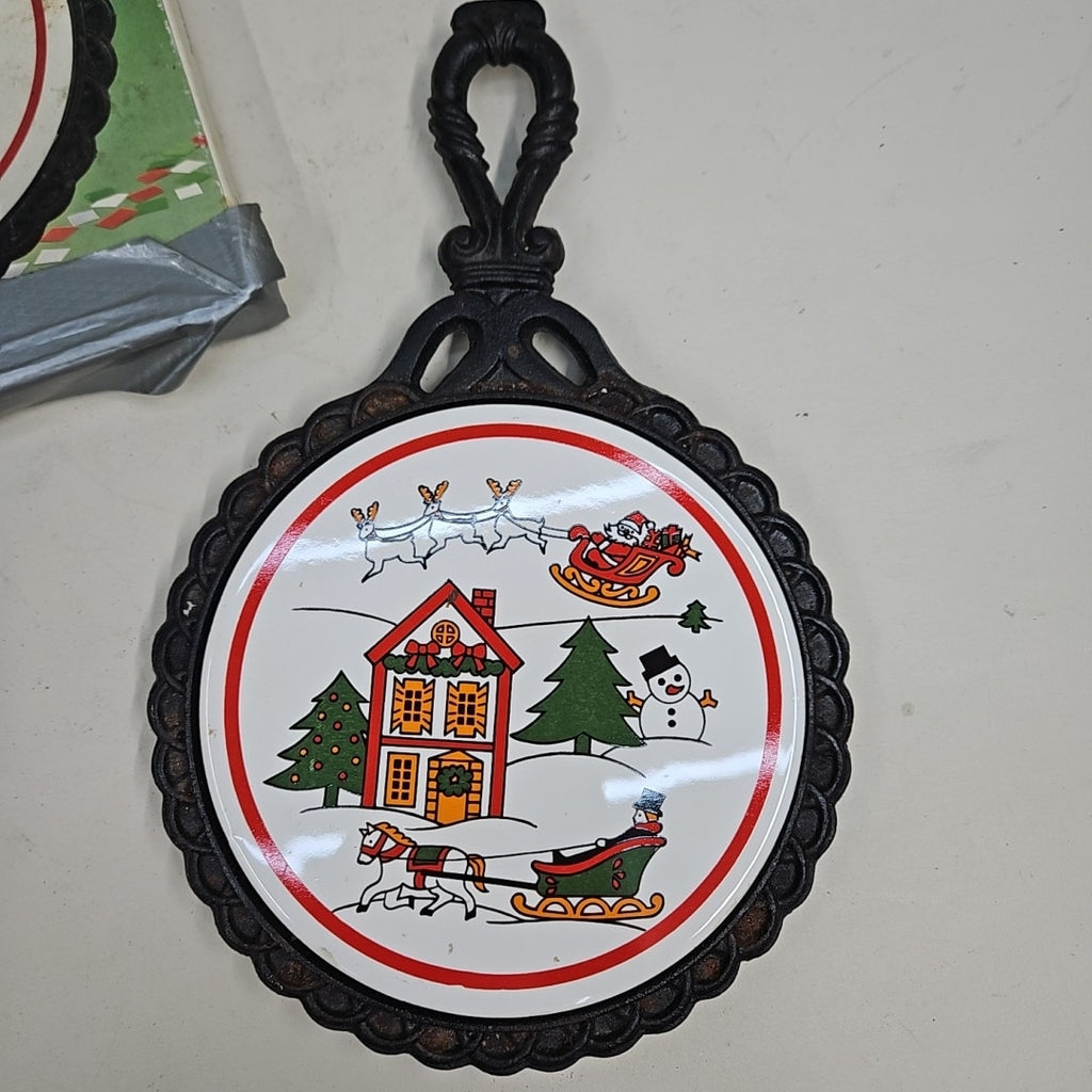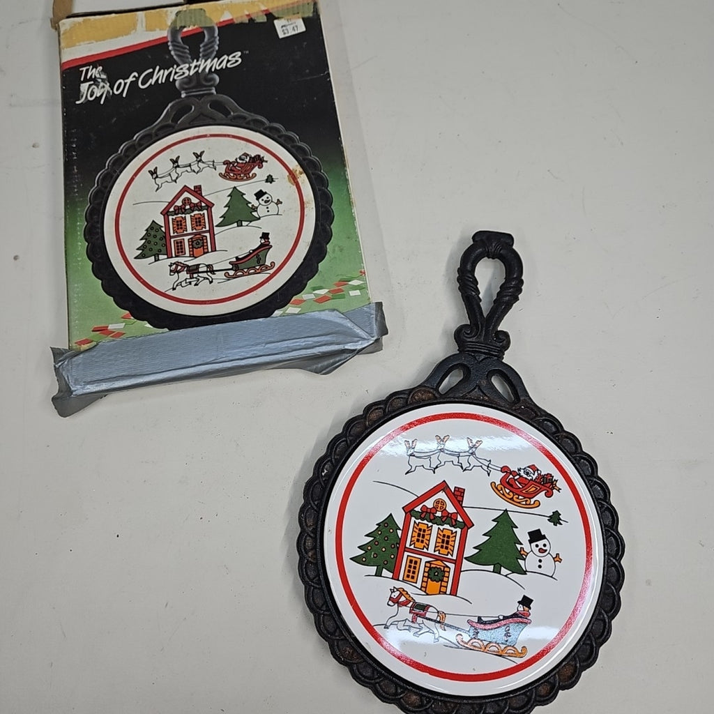 Vintage Joy of Christmas Cast Iron Trivet w/ Ceramic Tile -