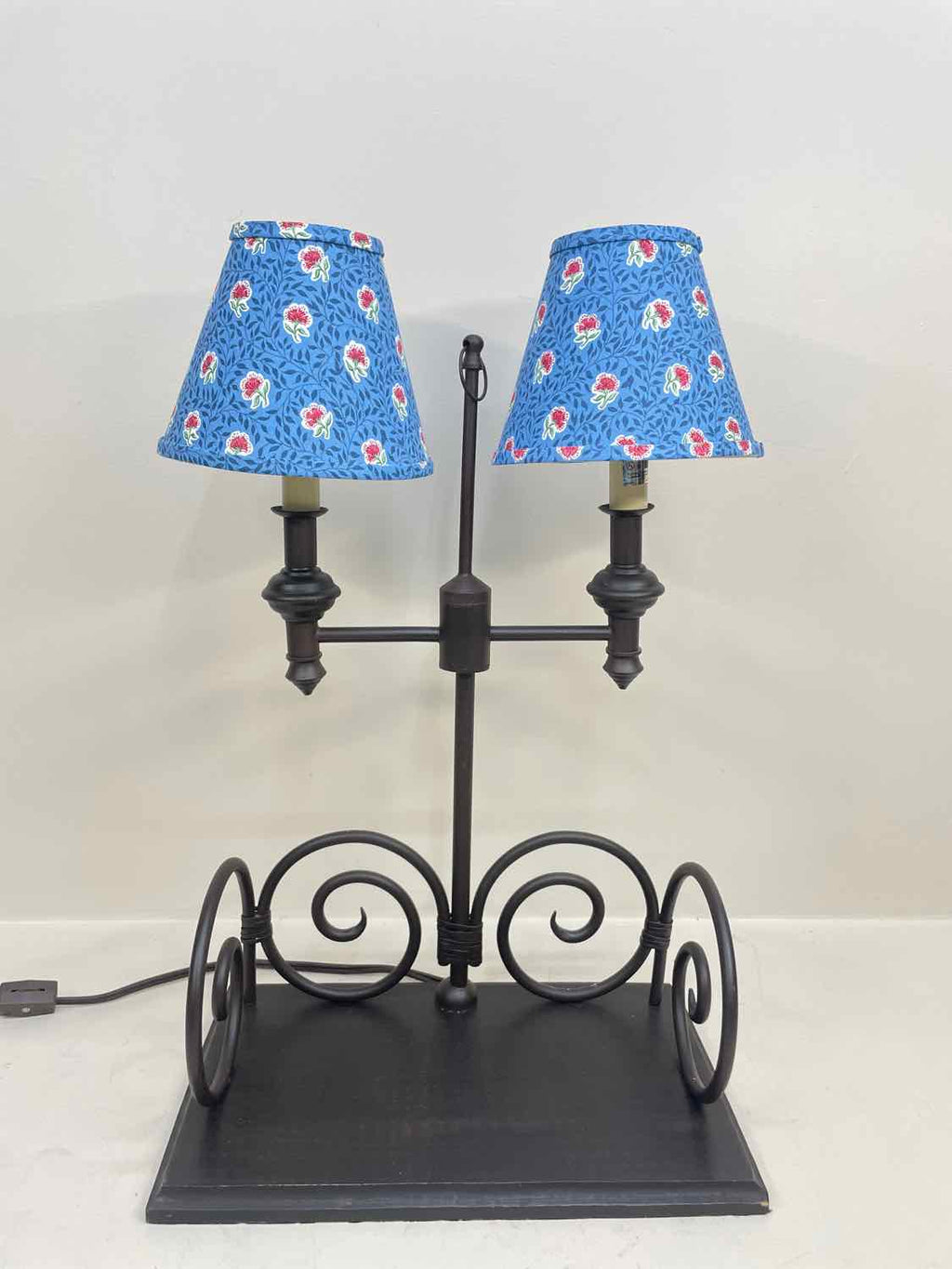 Metal Table Lamp / Stand w/ 2 Lights, Blue Floral Shades - 21" Tall